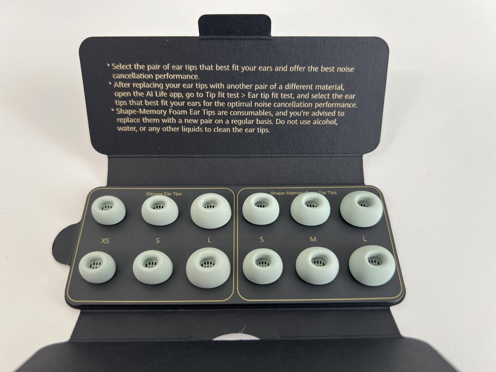 Bravo Huawei! În pachet primești mai multe dopuri din care să alegi. Nu doar trei mărimi, ca la majoritatea brandurilor, ci mai multe variante. Așa ar trebui să facă toți producătorii.