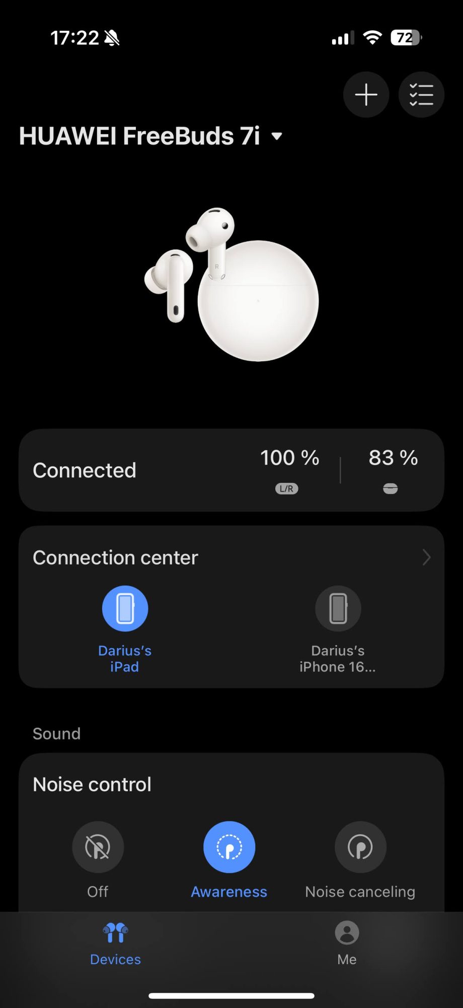 În aplicație ai toate opțiunile și vezi și cu ce dispozitive sunt împerecheate. Probabil informația vine de pe căști, că nu înțeleg cum ar putea fi altcumva, că nu sunt autentificat nicăieri.