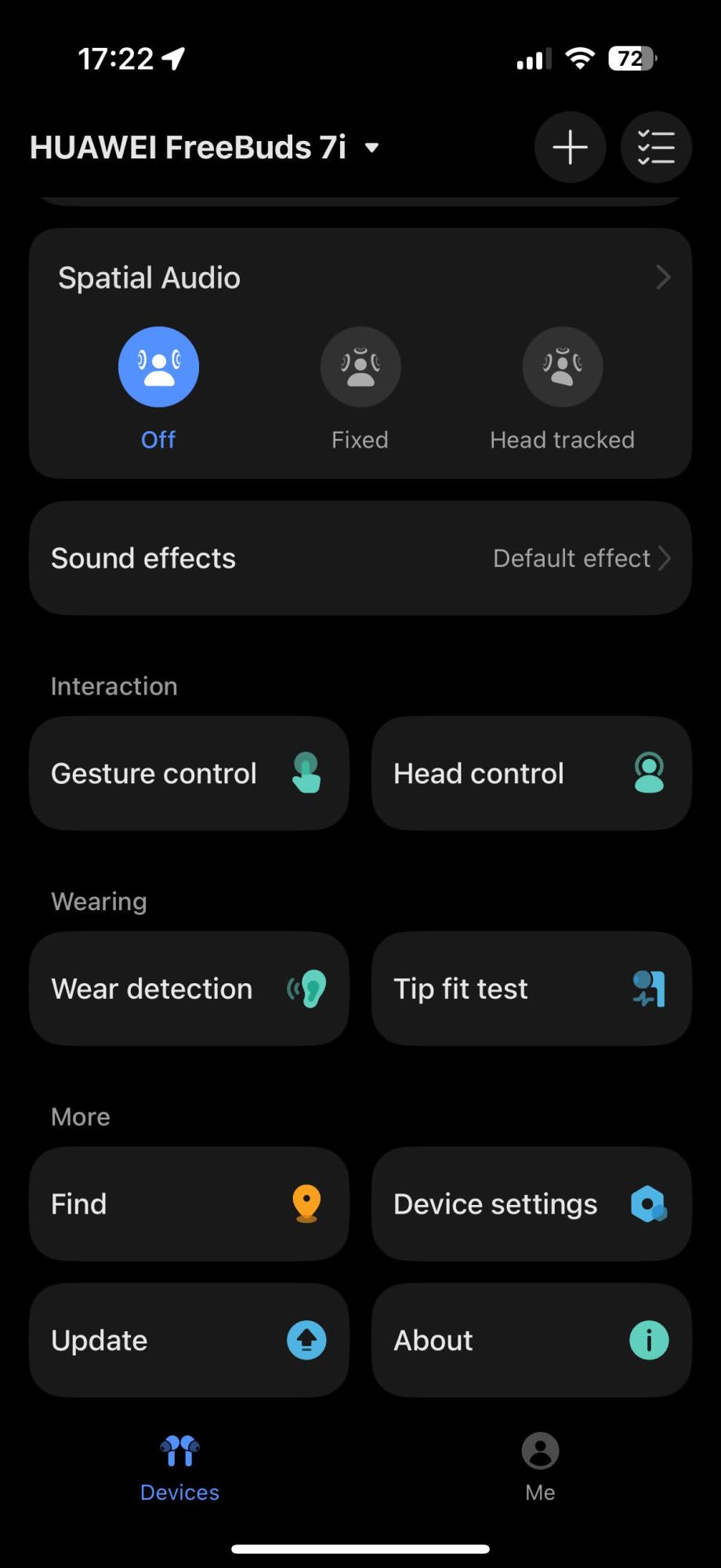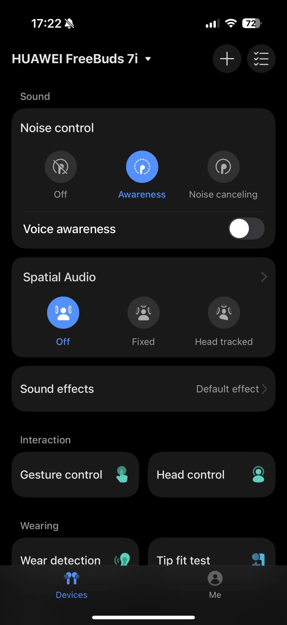 Revenind la aplicație, din aceasta poți seta cam tot. Am fost surprins să găsesc acolo toate opțiunile cu care eram obișnuit de la AirPods, de la configurarea anulării zgomotului în trei feluri: oprită, awareness (când auzi ce e în jurul tău) și noise canceling, până la configurarea spațialității, configurarea gesturilor de atingere (prin care poți să răspunzi/respingi apeluri sau să modifici volumul) și chiar configurarea gesturilor de mișcare a capului.