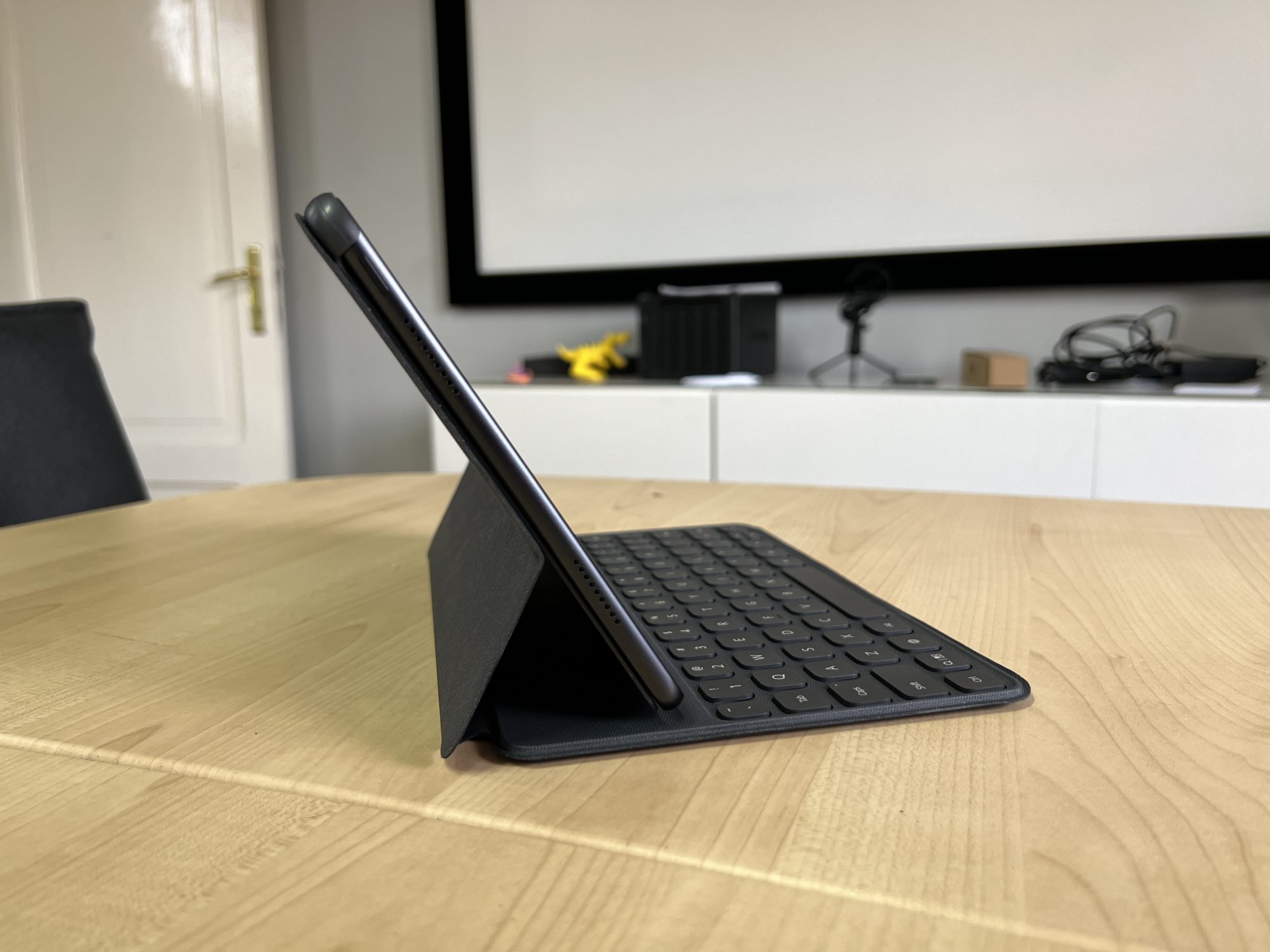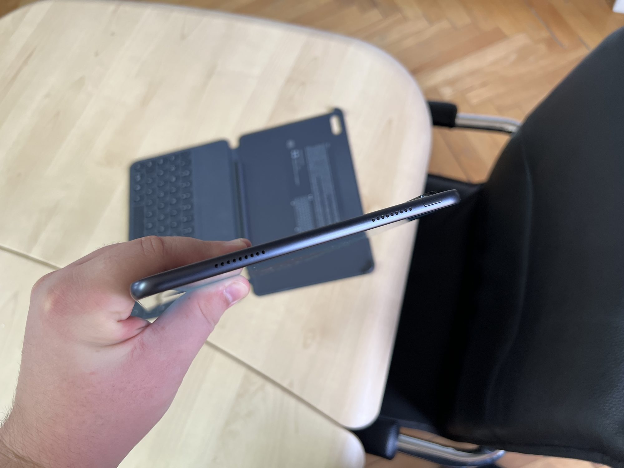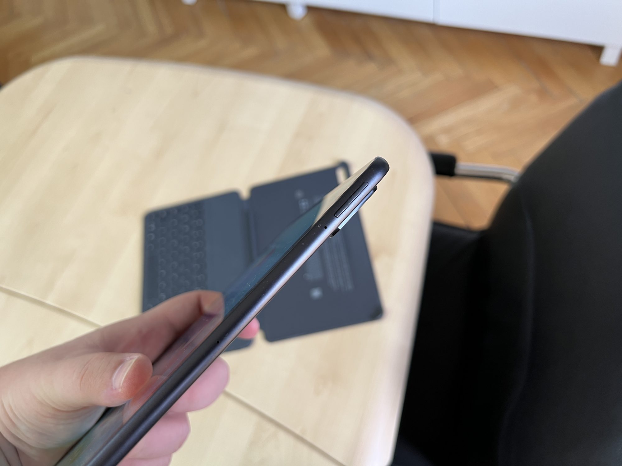 Si daca pui si tastatura fizica care se conecteaza prin Bluetooth, o sa ai un mini laptop. Cu tastatura atasata poti sa editezi diferite fisiere sau sa faci cautari mai rapide pe internet. Mi-ar fi placut sa aiba si un trackpad mic ca sa nu mai depindi de ecran, desi este la cativa cm de tine.