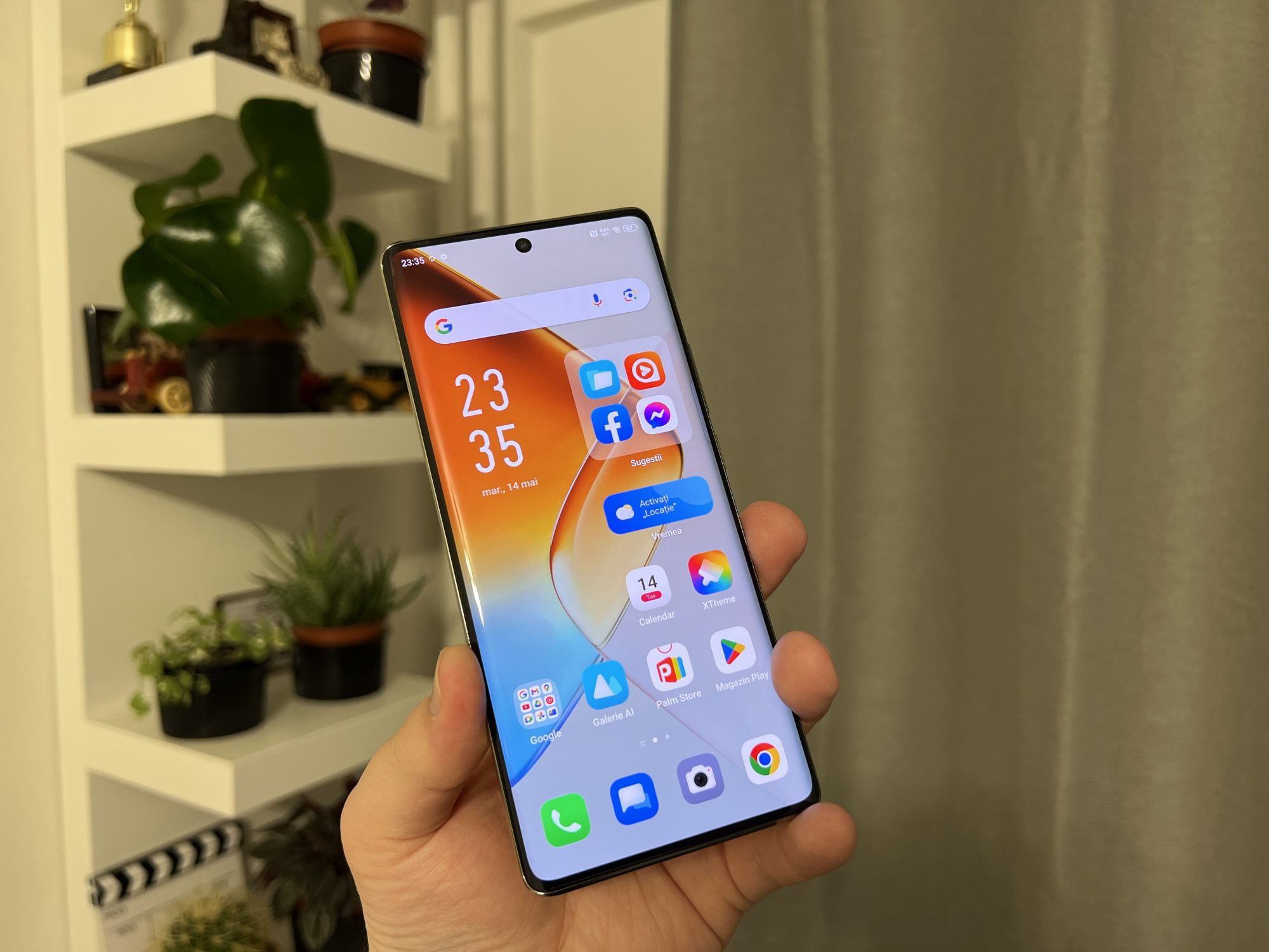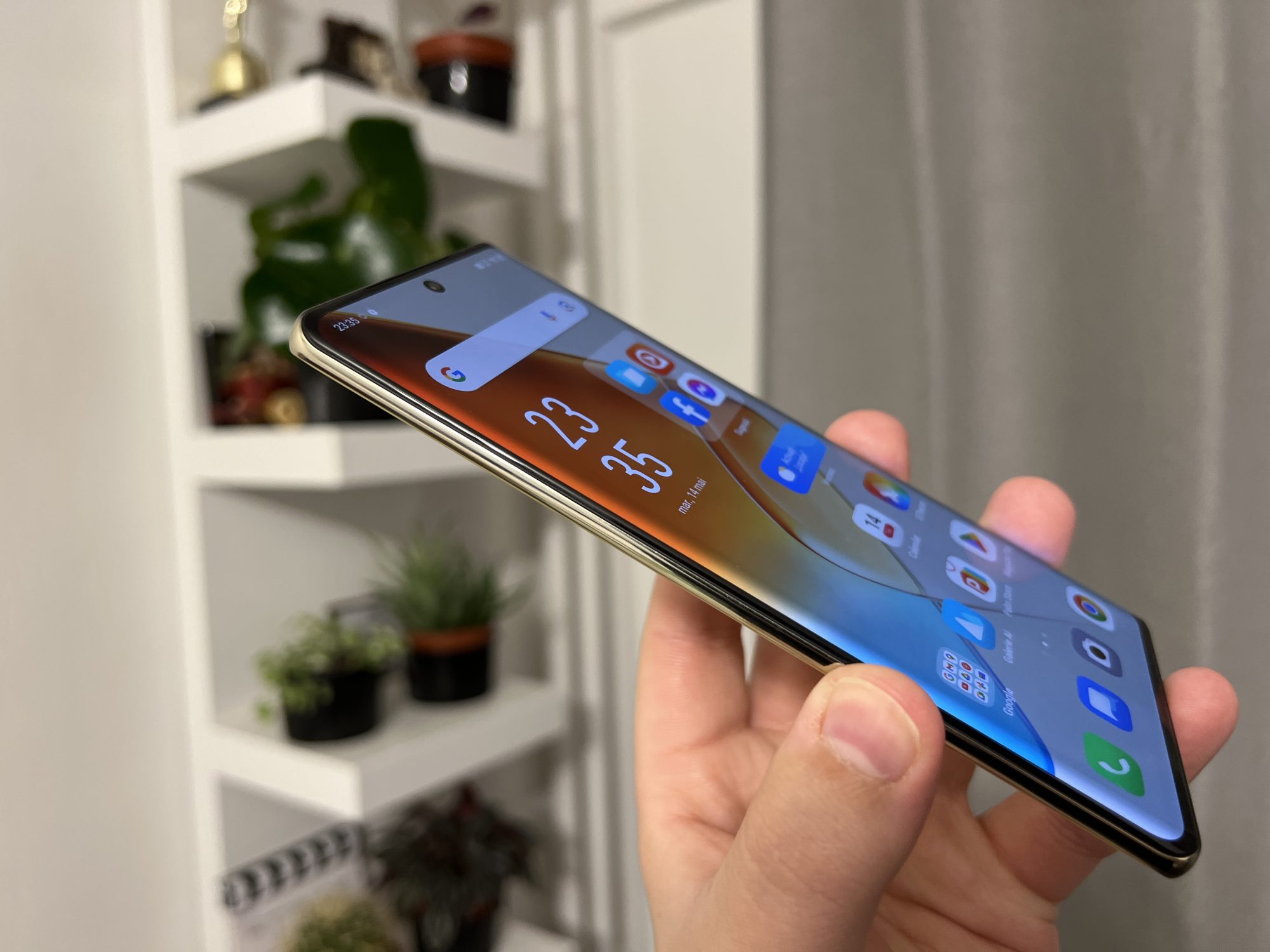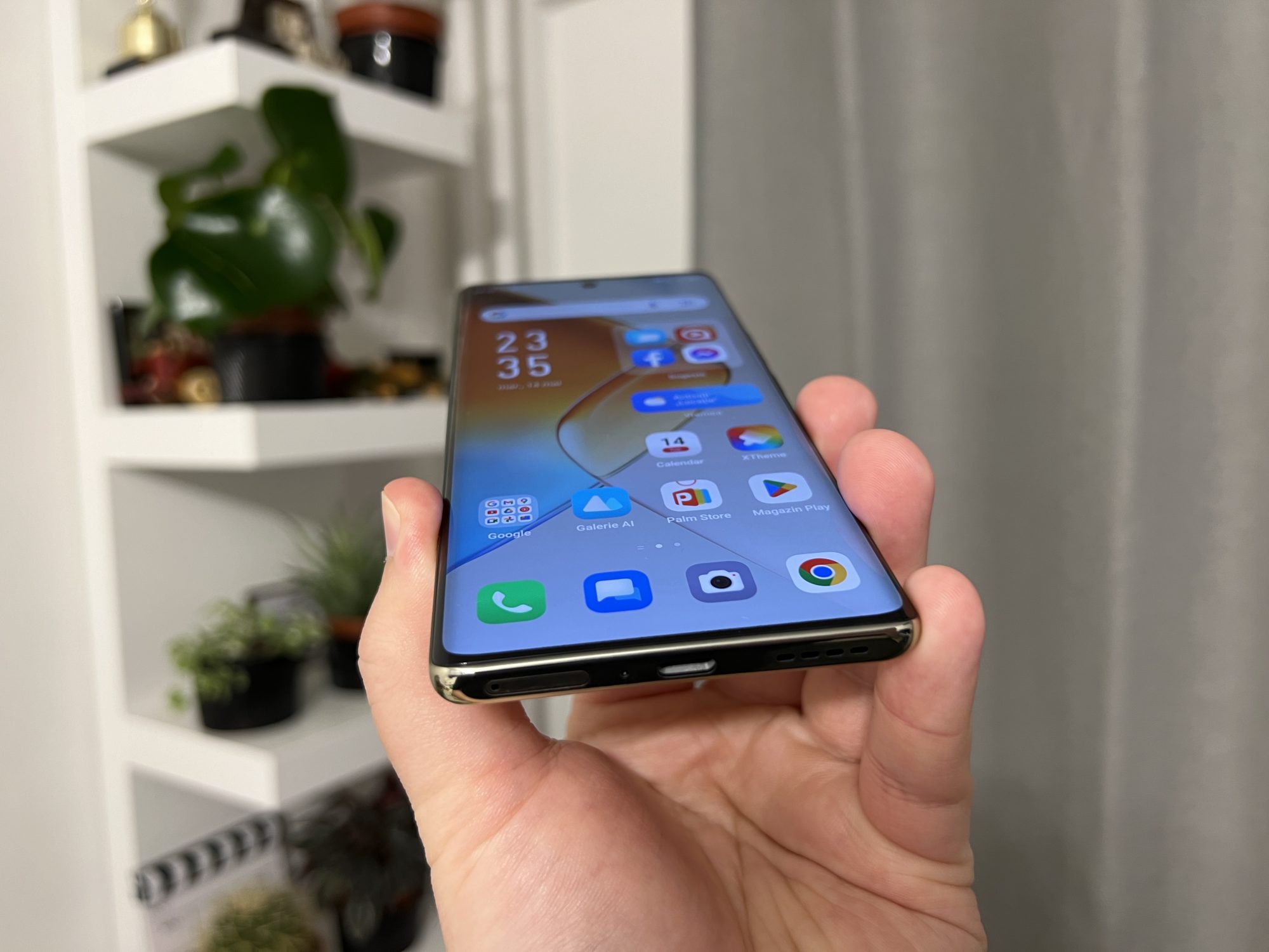 Not bad! Sa stiti ca telefonul nu arata rau, insa ma duce putin cu gandul la niste modele mai vechi de Samsung Note. Este un telefon destul de lat si cu ecran curbat, ceea ce inseamna ca nu este usor de tinut in mana si este si foarte alunecos fara husa. Spatele este dintr-un plastic realizat excelent care te pacaleste ca este sticla. Are si o textura interesanta si niste reflexii dragute in bataia soarelui.