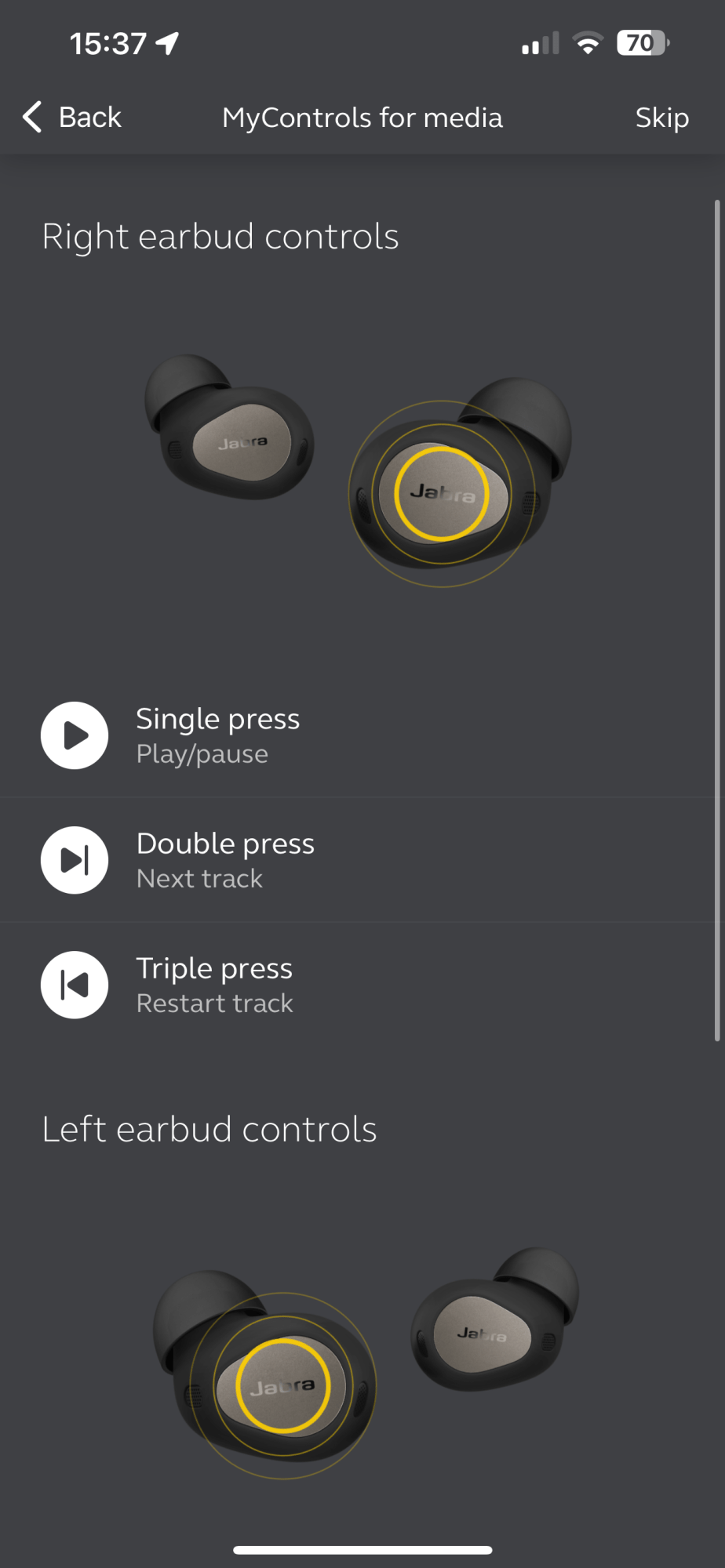 Pe smartphone am instalat Jabra Sound+ și am putut verifica gesturile cu care pot controla căștile, am setat nivelul de ANC, am putut alege dacă vreau să controlez Spotify sau asistentul vocal al telefonului, am setat tipul de redare audio, mi-am înregistrat produsul pentru doi ani de garanție împotriva defectelor cauzate de apă și praf și am descoperit că le pot urmări localizarea, pe baza ultimei conectări cu telefonul.