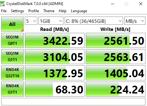 SSD-ul este in format M.2 PCI Express x4 si promite viteze teoretice de 3500MB/s la citire si 2500MB/s la scriere. Tot teoretic, adica in conformitate cu specificatiile, are un MTBF de 2.000.000 ore si un TBW de 300TB. Valori foarte bune.