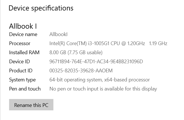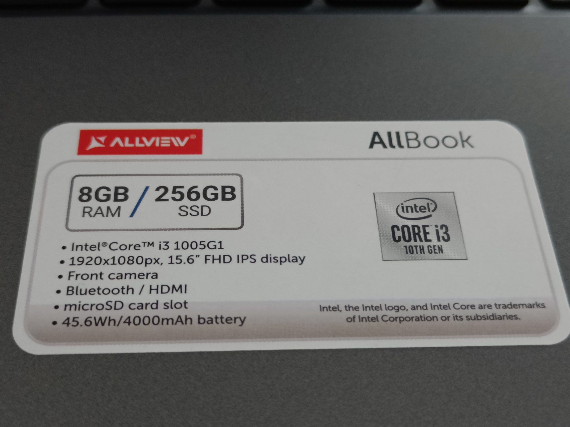 Allbook I are un display IPS LCD anti-glare, de 15,6 inci, cu rezoluție 1920×1080 pixeli și format 16/9. Avem, de asemenea, 8GB DDR4 memorie RAM, 256GB SSD M2 spațiu de stocare, difuzoare stereo 4 x 8Ω/1W. GPU integrat este un Intel UHD Graphics, iar ptocesorul este Intel Core i3-1005G1, pe 10 NM, dual core la 1.2 GHz, cu până la 3.4 GHz în regim Turbo.