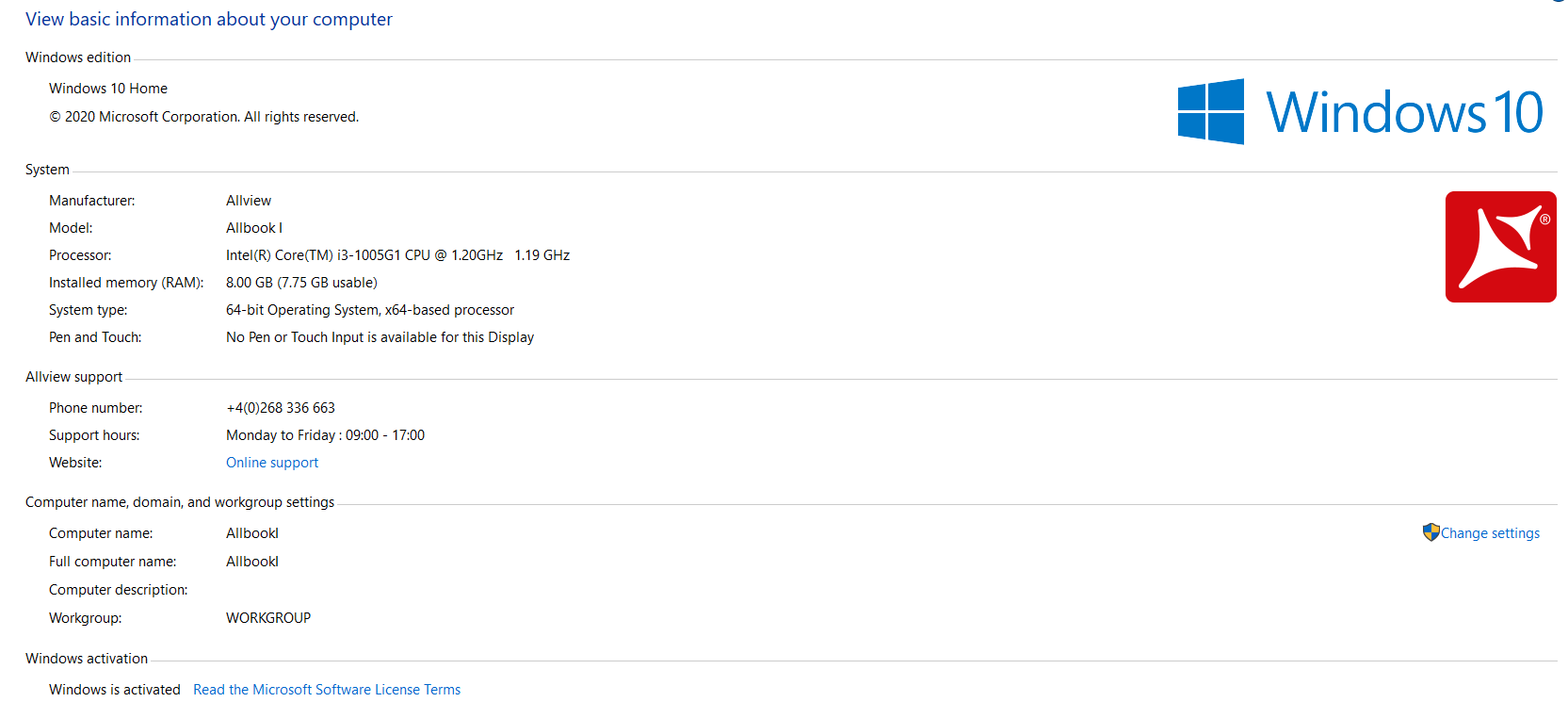 Laptopul a venit cu Windows 10 Home preinstalat, dar nu știu dacă așa este livrat și la achiziție. Pe site-ul Allview apare cu Windows 10 Professional, iar pe eMag cu FreeDOS.