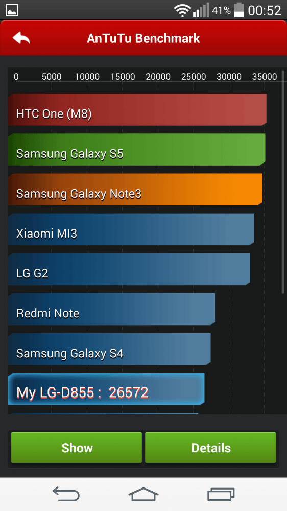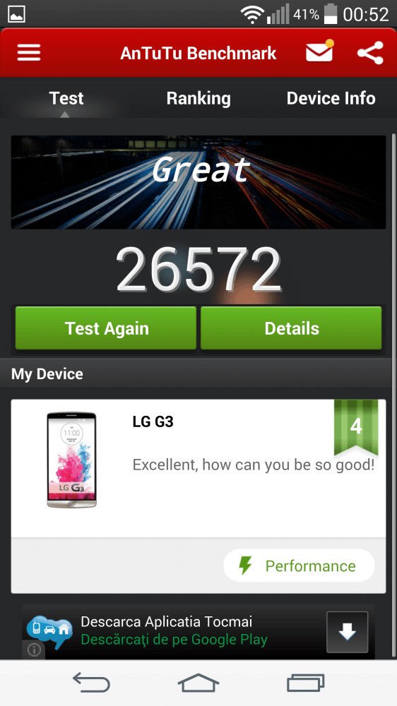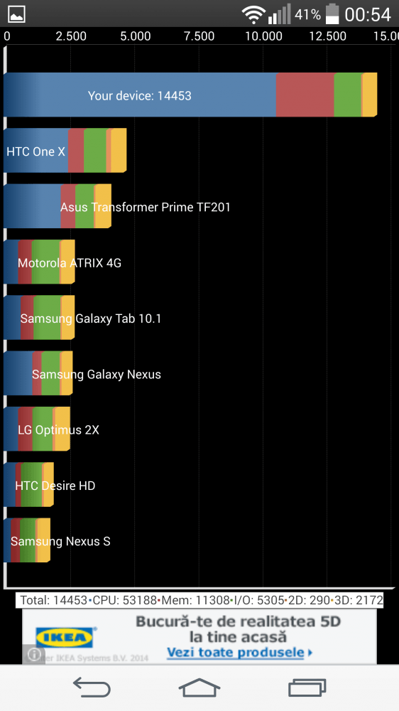 Legat de benchmark-uri, acestea nu au fost tocmai precise. Nu inteleg din ce cauza, dar rezultate au fost sub G2 si sub multe modele lansate anul trecut. Se pare ca problema a fost doar la acest terminal pentru ca in top am vazut LG G3 peste S5 sau HTC One M8. Nu imi explic acest lucru, si ca sa vedeti despre ce vorbesc am atasat o poza din AnTuTu.