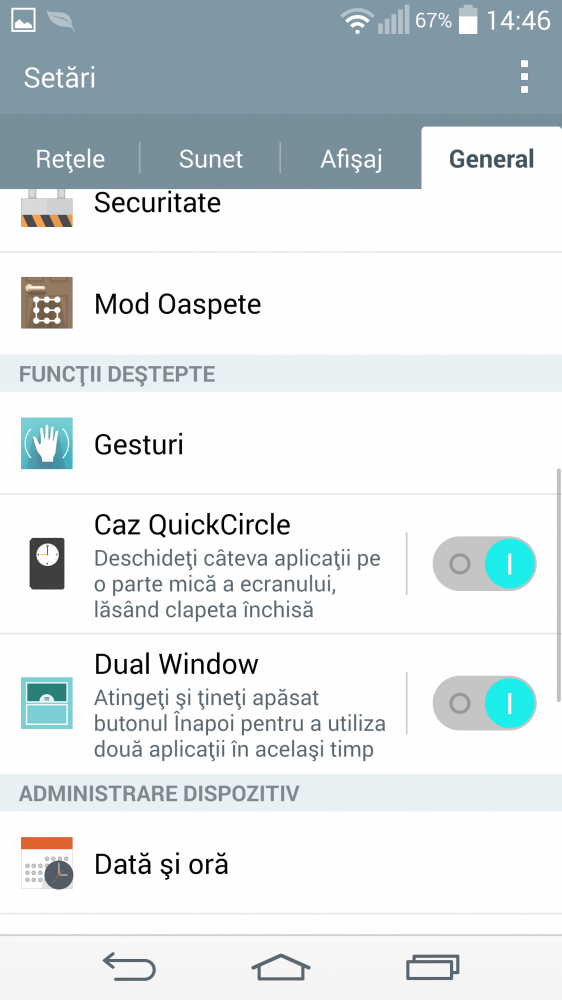 Pe partea de software avem Android 4.4.2 cu interfata LG ce seamana foarte mult cu cea de la Samsung. Trecand pesta asta, iata ce functii si ce setari interesante are acest LG G3. In primul rand aveti deblocoare prin Knock Code, adica un set de gesturi pentru a debloca ecranul. Este o functie interesanta pe care am folosit-o tot timpul. Va alegeti de cate ori sa bateti pe ecran si in ce zone si ati deblocat telefonul.