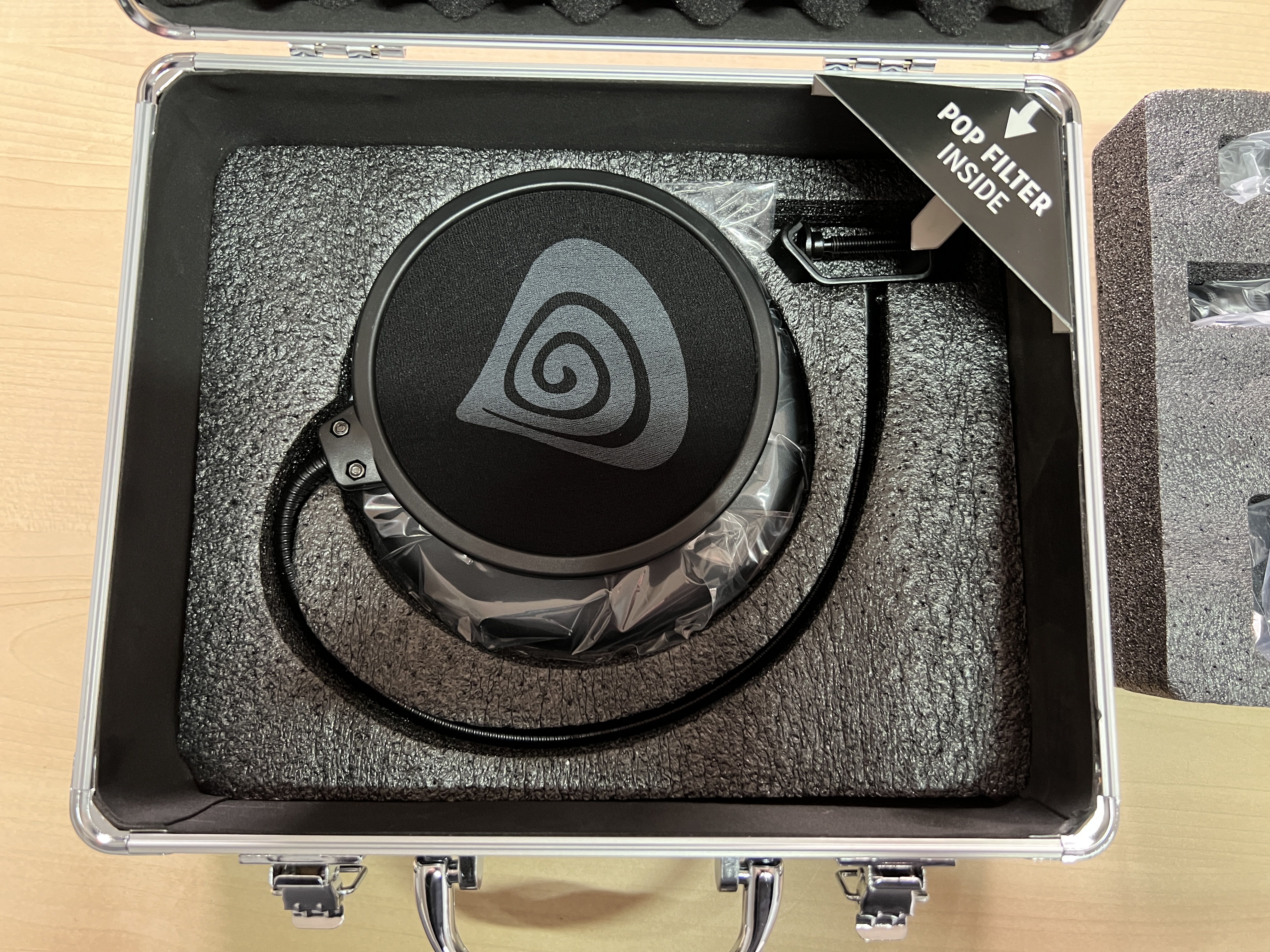 El este oferi intr-o cutie foarte interesanta. Ambalajul este de nota 10. Valiza arata bine si este impachetat superb. In interior o sa gasiti tot ce aveti nevoie pentru montaj. Are o talpa metalica generoasa, un picior metal solid, un filtru flexibil, o constructie metalica si un pop filter.