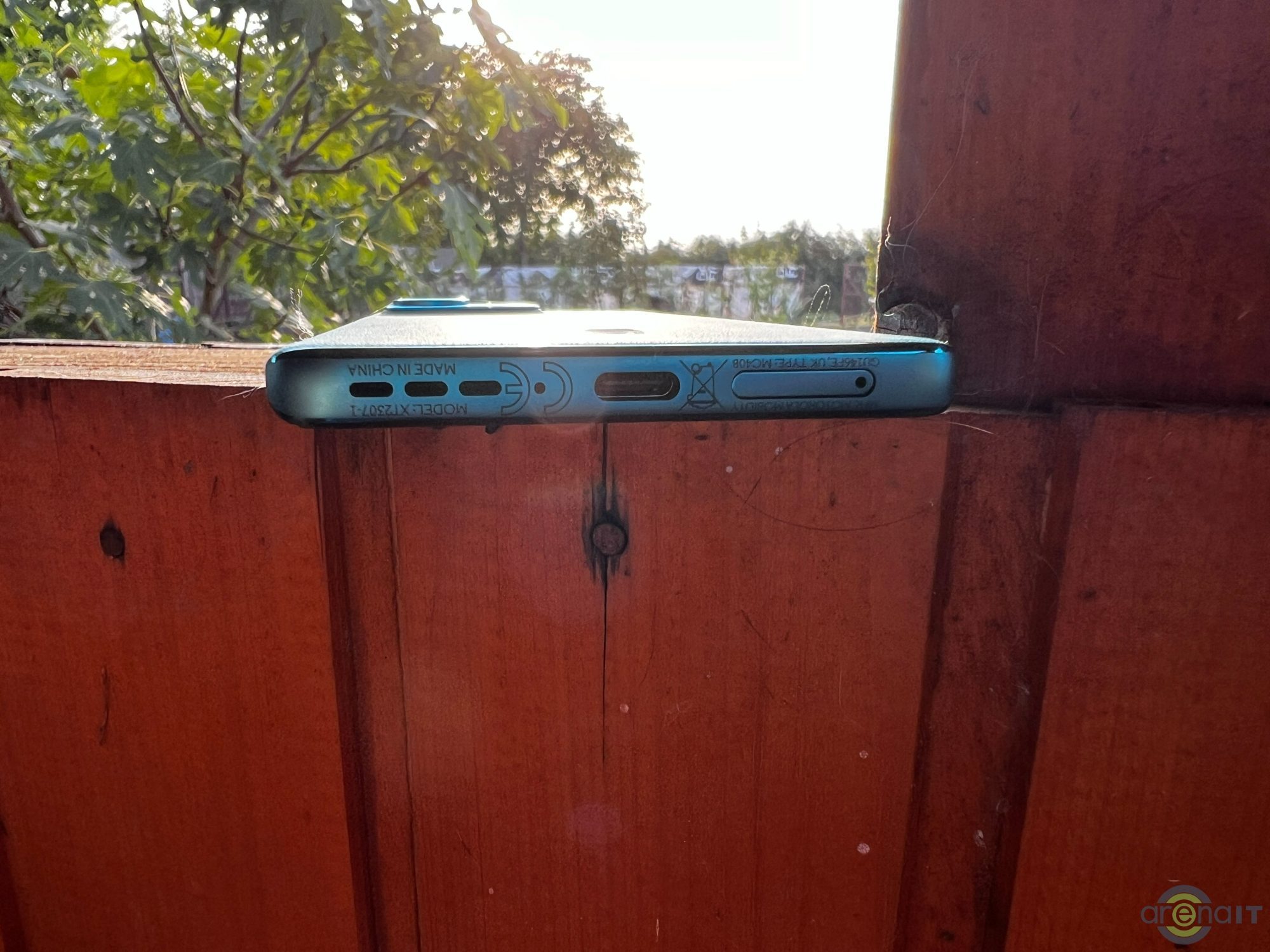 Partea de jos are mufa de încărcare, difuzorul și tăvița pentru cartela SIM (deși telefonul suportă și eSIM?!?) și un mic text care spune că modelul este construit în China.