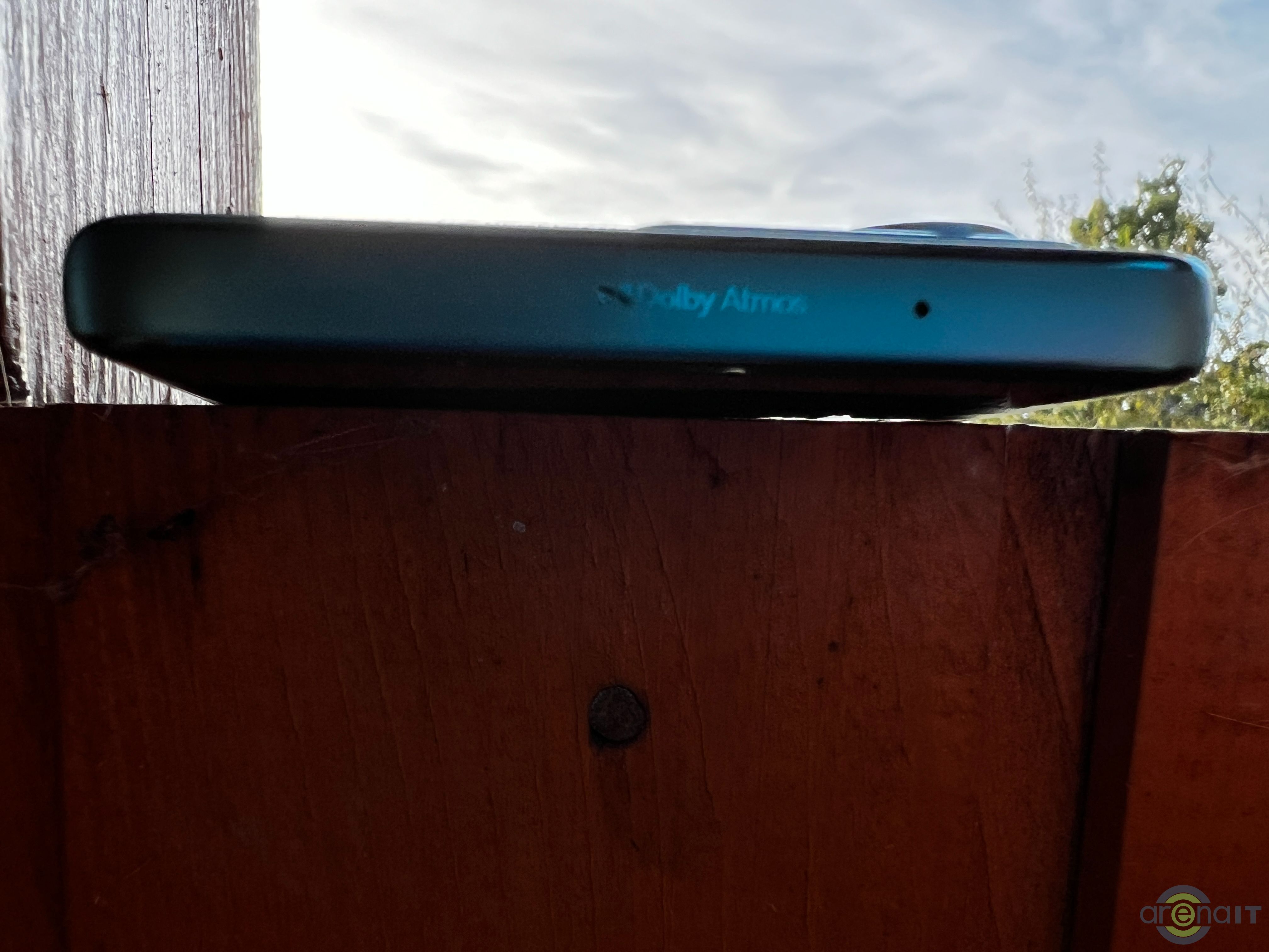 Pe partea dreaptă regăsim ambele butoane – cel de power și cel de reglare sonor, ceea ce face mai dificil capturile de ecran. Noroc că poți face asta direct cu gesturi. 🙂 Pe cealaltă parte nu avem niciun buton, la fel cum pe marginea de sus nu avem decât antena și mențiunea că telefonul vine echipat cu tehnologia Dolby Atmos.