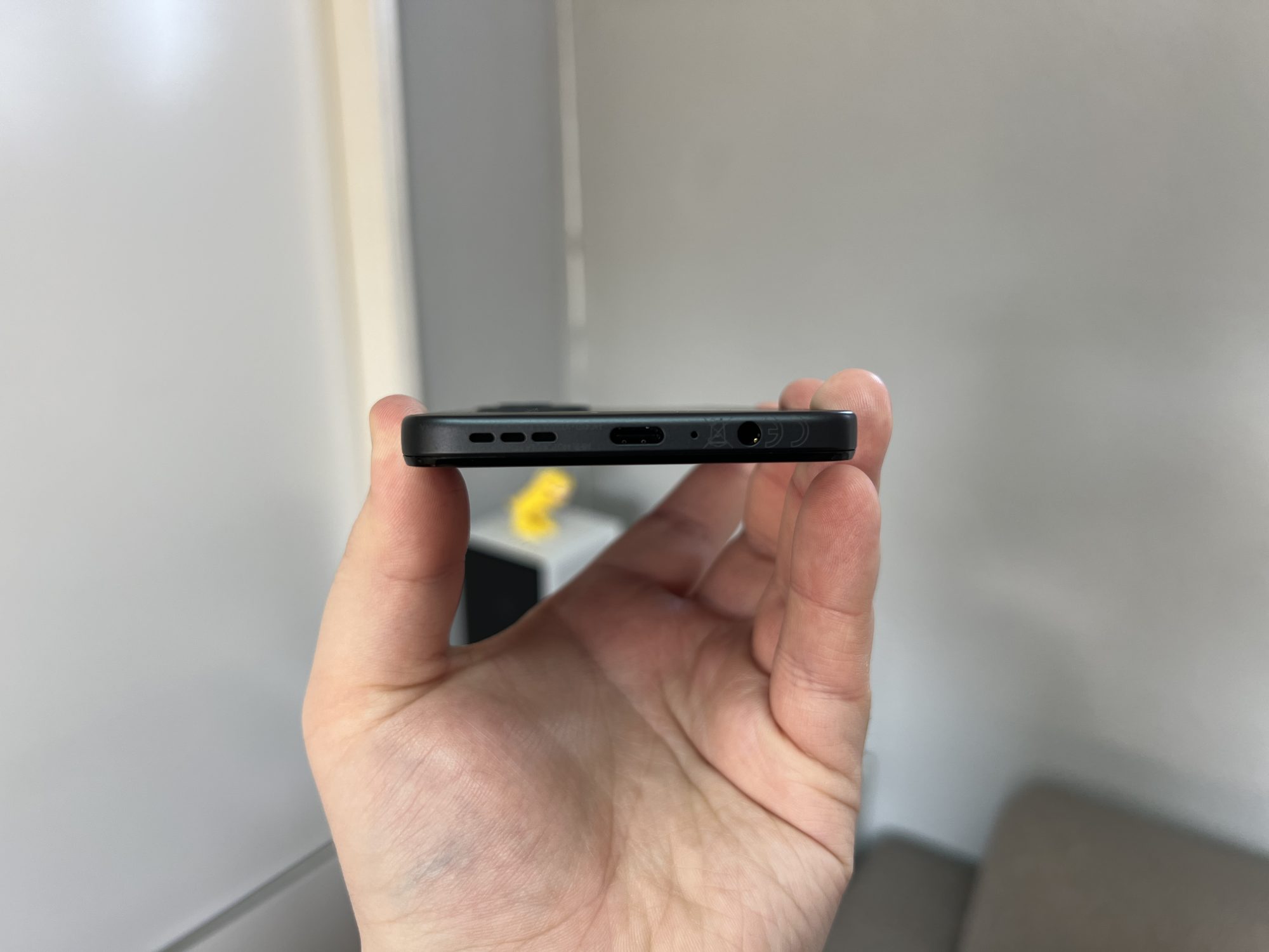 Pe laterala stanga se regaseste portul pentru SIM, iar langa portul USB C pentru alimentare avem o surpriza placuta. Este unul dintre putinele telefoane care adopta jackul 3.5mm in 2024, ceea ce este fantastic pentru cei care folosesc casti cu fir sau chiar lavaliere.