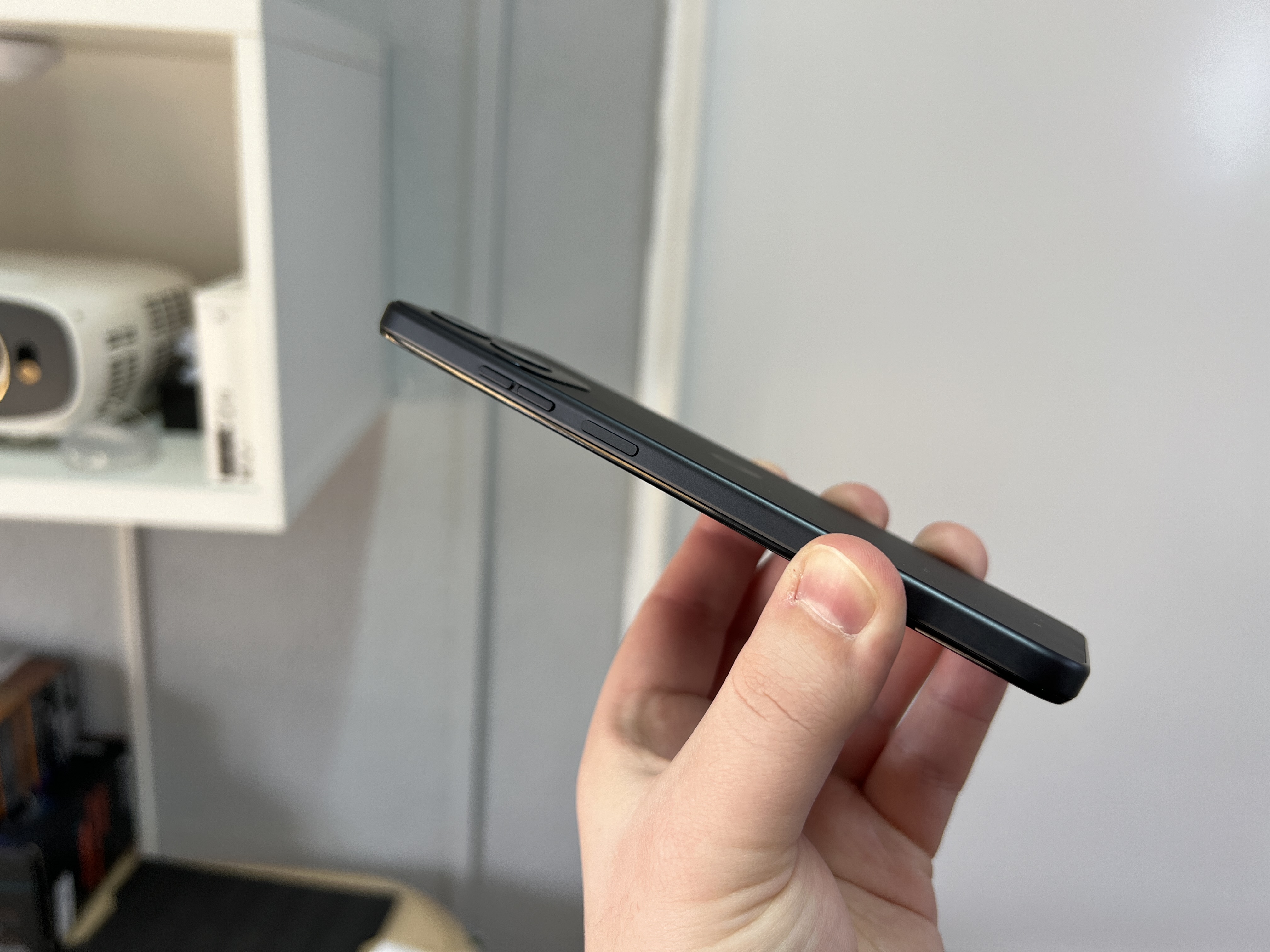 Se simte foarte placut, premium daca imi permiteti, desi zona de pret este alta. Butoanele de volum tip pastila sunt comode si pozitionate bine, iar butonul de Power integreaza si senzorul de amprenta.