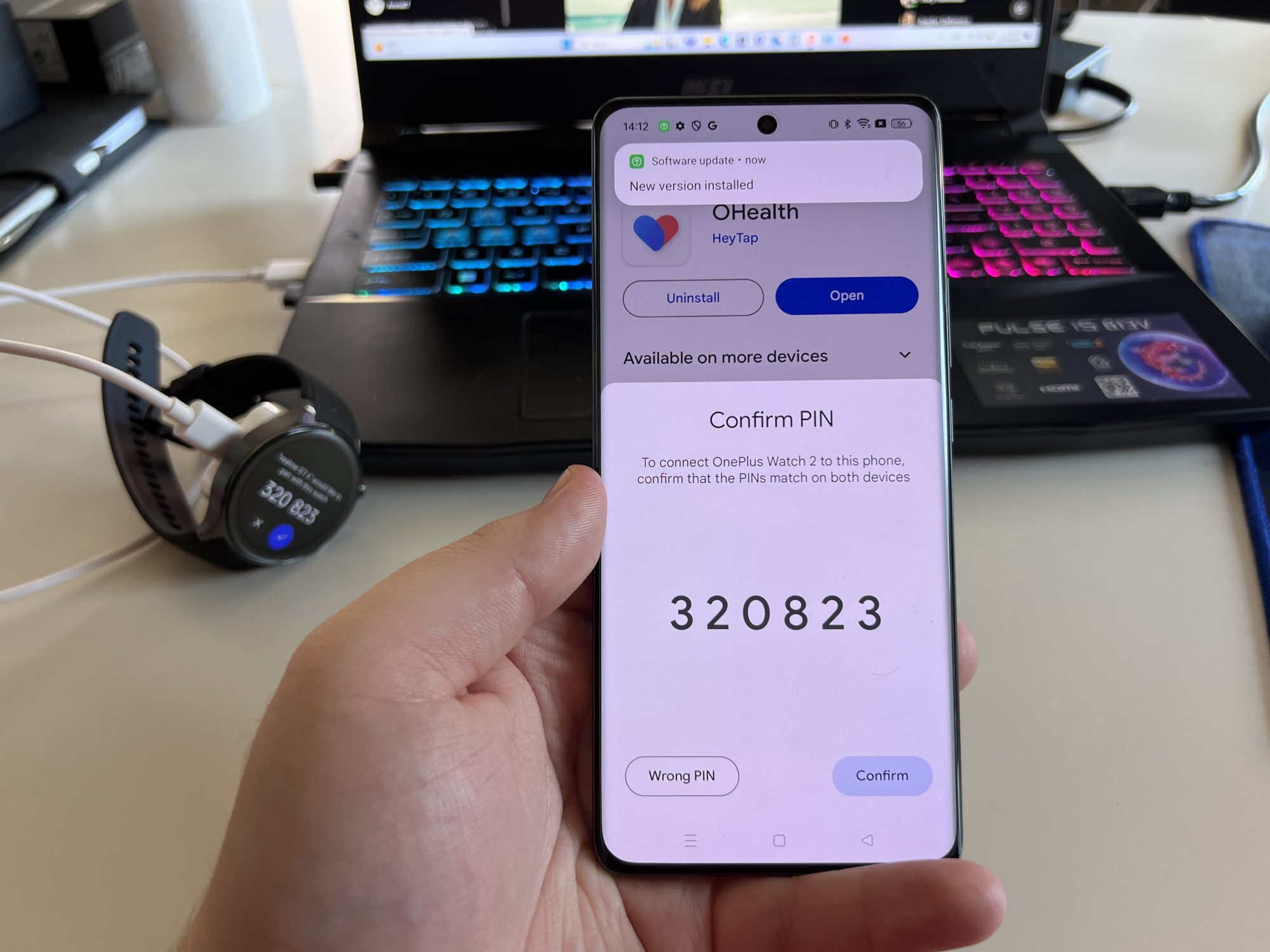 Telefonul a detectat automat ceasul in timp ce se incarca. Pur si simplu a aparut o notificare pe telefon ca in apropiere este un OnePlus Watch 2. Am asociat dispozitivele imediat, in mai putin de 1 minut.