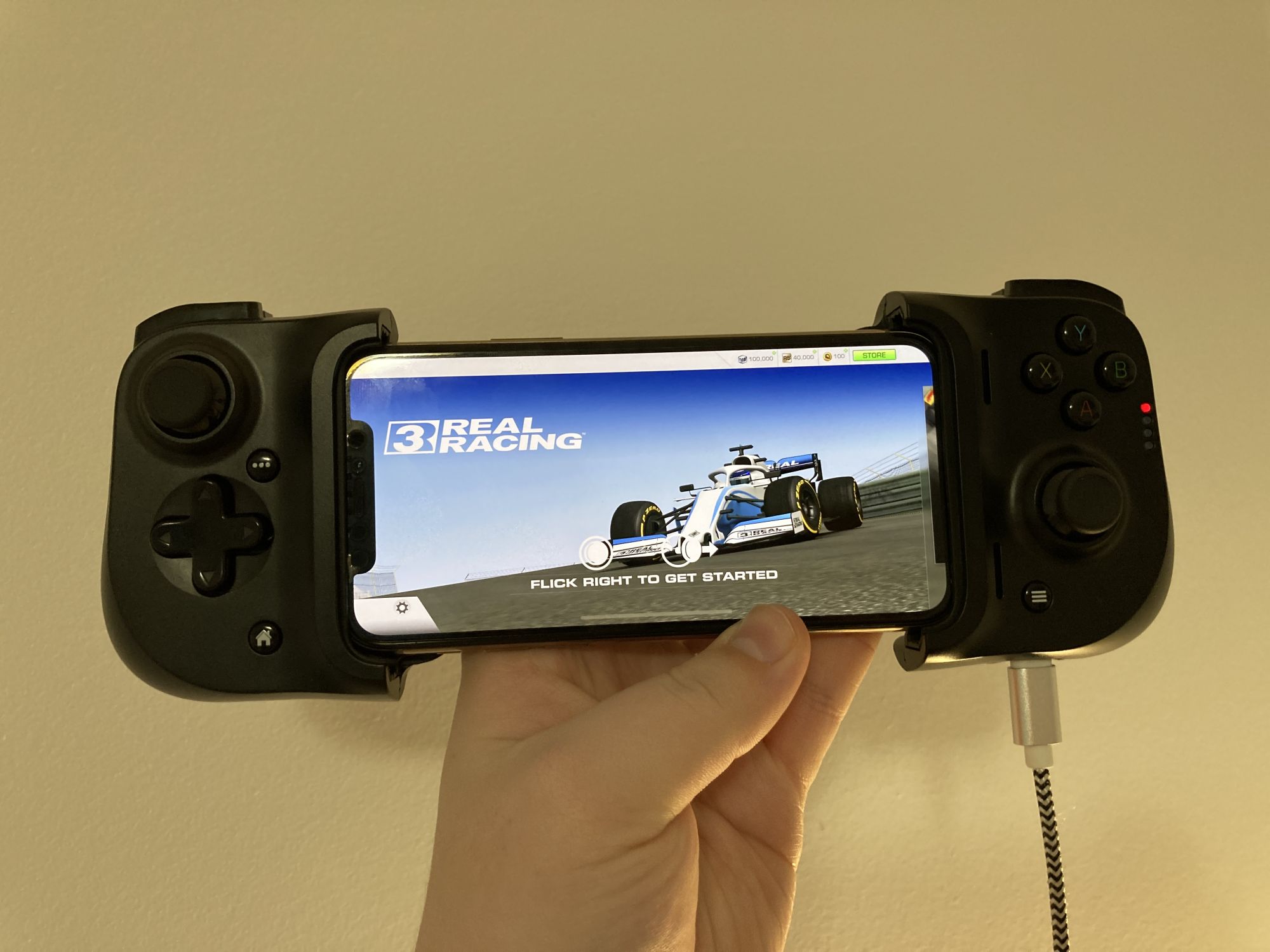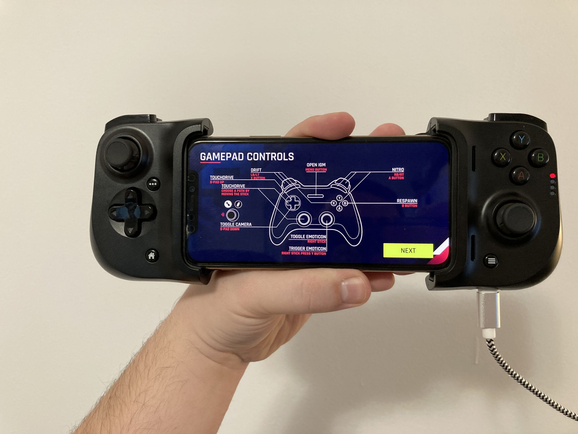 El se strange si devine compact cand nu este folosit, are un port Lightning pentru alimentare atunci cand telefonul este in actiune, LED-uri pentru statusul bateriei si cam atat. In rest arata fix asa cum il vedeti si voi, este construit foarte bine si tot ce trebuie sa mai faci este sa te joci.