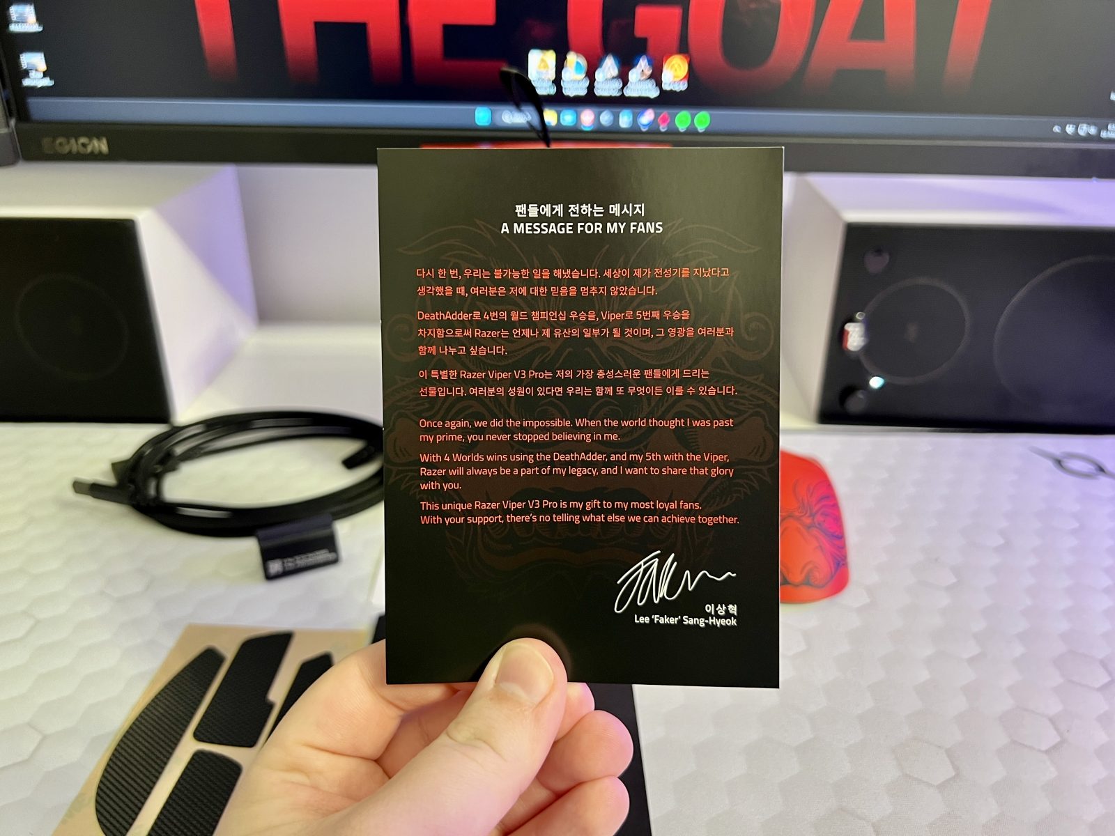 „Așa cum unii dintre voi știu, am făcut mai multe schimbări înainte de Campionatul Mondial de League of Legends din 2024. Mi-am schimbat mouse-ul, mousepad-ul și chiar mi-am ajustat postura”, a declarat Lee „Faker” Sang-Hyeok. „Ceea ce îmi place cel mai mult de când am trecut la Razer Viper V3 Pro este cât de confortabil este, chiar și după utilizare îndelungată. Cum mulți fani sunt curioși în legătură cu produsele pe care le folosesc, îmi imaginez că unii dintre ei vor dori să încerce același mouse ca mine. Acest mouse este pentru ei și sper că atunci când îl vor folosi, să fie la fel de mulțumiți de produs.”