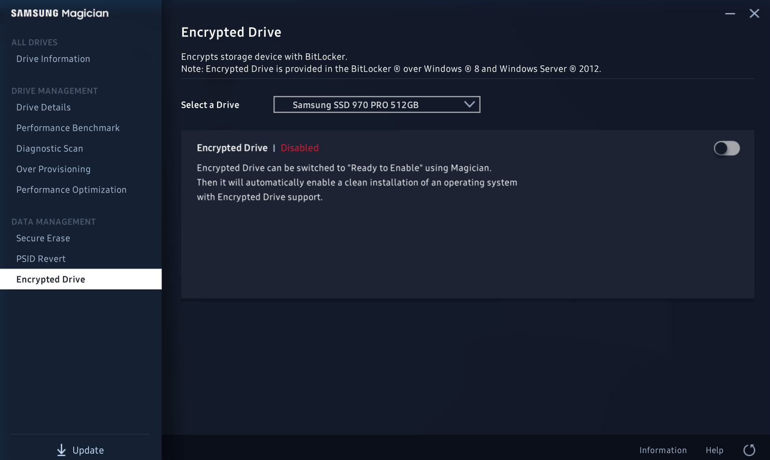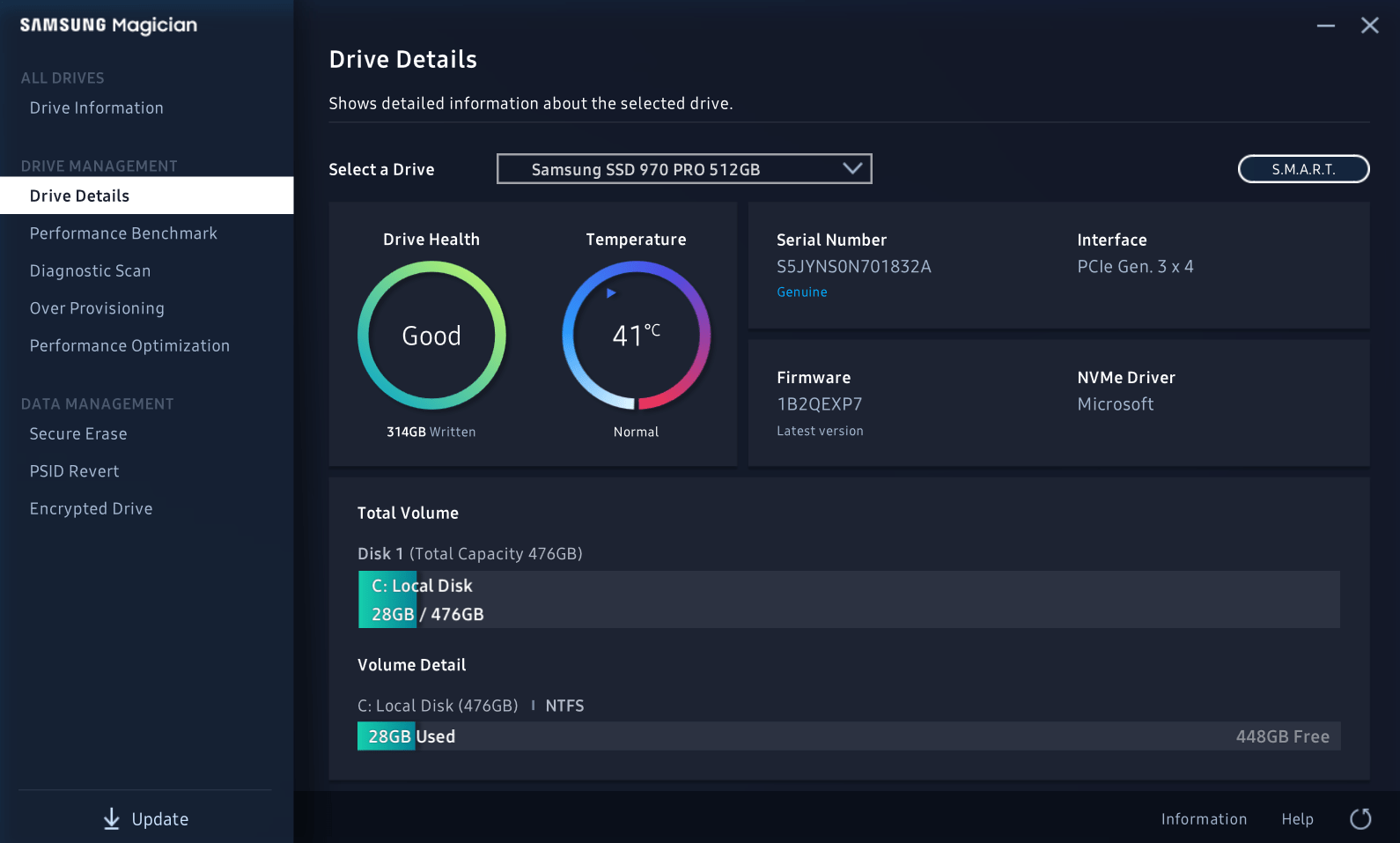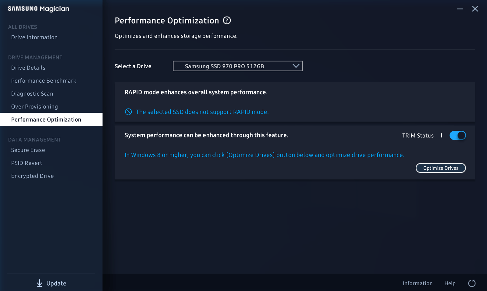 Aplicatia Samsung Magician este foarte utila daca vrei sa vezi statusul SSD-ului. Iti arata temperatura de operare, in ce stare se afla SSD-ul si poti vedea inclusiv vitezele de scriere sau citire. Il poti optimiza pentru Windows 10, poti crea partitii noi sau poti sa-l criptezi.