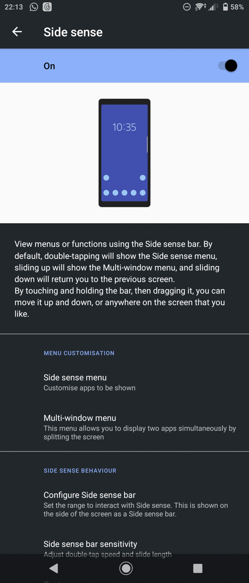 Side Sense este o funcție menită să ușureze utilizarea telefonului cu o singură mână, oferind un meniu mic din care poți lansa aplicațiile preferate, precum și a porni anumite functii ad-hoc, precum “Multi Window” și “One-Handed Mode”. Acesta se activează la o atingere dublă a marginii telefonului, de unde poți configura diferite acțiuni/gesturi. Nu am găsit prea folositoare opțiunea, pentru că mi se pare că o activam accidental.