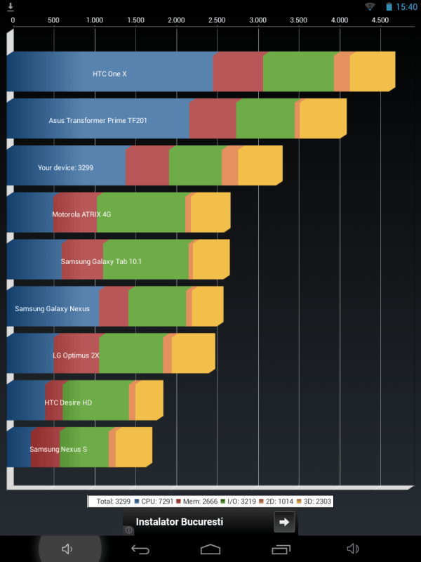 Difuzor. Tableta sta destul de bine si aici. Nu iese in evidenta, dar nu am nimic de comentat. Difuzorul este unul destul de mare (nu chiar mare, dar pentru unii poate pare gigantic). Daca stii sa umbli putin la egalizator, se aude destul de bine pentru o tableta.