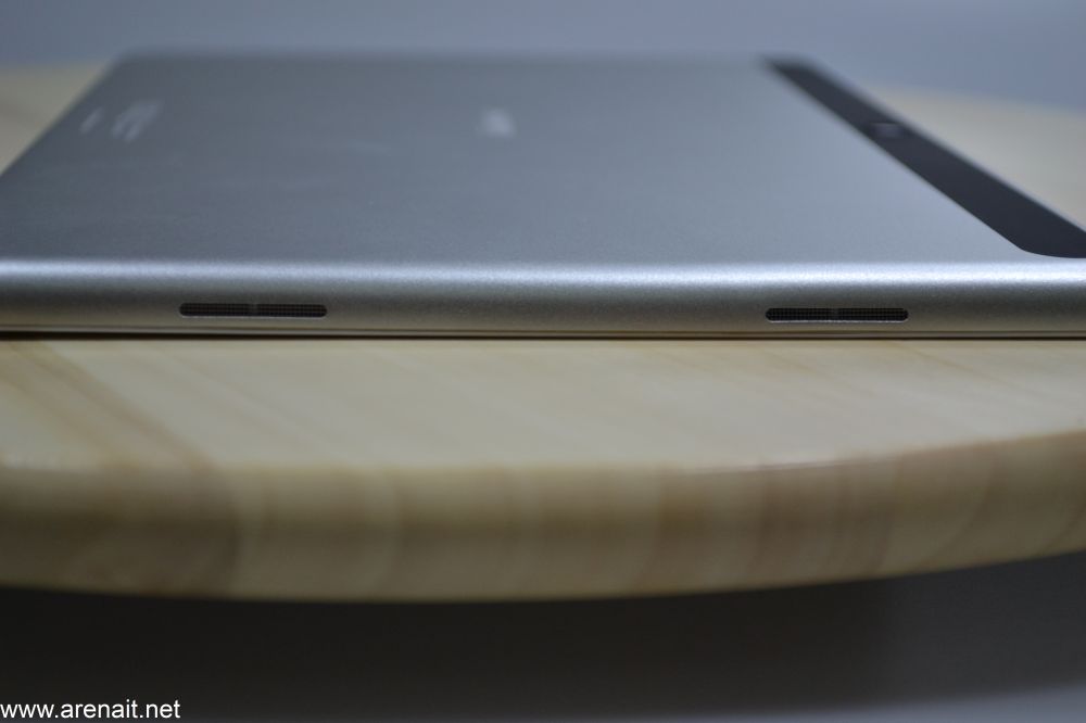 Tableta este contruita din aluminiu, iar pe parte din fata este un panou din sticla. Privita in mod landscape, butoanele de volum si de power sunt pe partea de sus, in timp ce toate porturile tabletei (mufa de incarcare, mini HDMI, micro usb, slot microsd, jack pentru casti) sunt pe partea din dreapta. Difuzoarele sunt pozitionate pe latura stanga, vizibile prin cele doua orificii dedicate. Pe partea din spate, se afla camera de 5 MP si o zona din plastic ce probabil este pusa pentru a ascunde antenele.