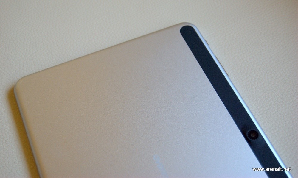 La capitolul design tableta nu sta rau deloc, pe spate are un capac metalic iar in jurul camerei foto e un element cauciucat. Nici pe partea din fata nu avem de ce sa ne plangem, marginile tabletei nu sunt groase, desi puteau fi un pic mai subtiri, iar finisajele sunt bune.