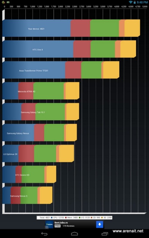 Sistem de operare. Ruleaza Android 4.2 si raspunde foarte bine la comenzi. Nu are lag sau intreruperi. Un singur lucru urasc la Android 4.2 pe tablete: butoanele de back, home si menu sunt puse pe mijloc. Daca tableta are 7 – 8 inch e ok, dar daca are 10 inch nu e deloc ok, sa iti intinzi degele pana la jumatatea tabletei pentru a atinge pe home.