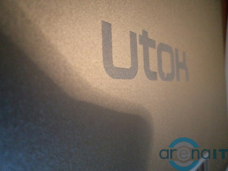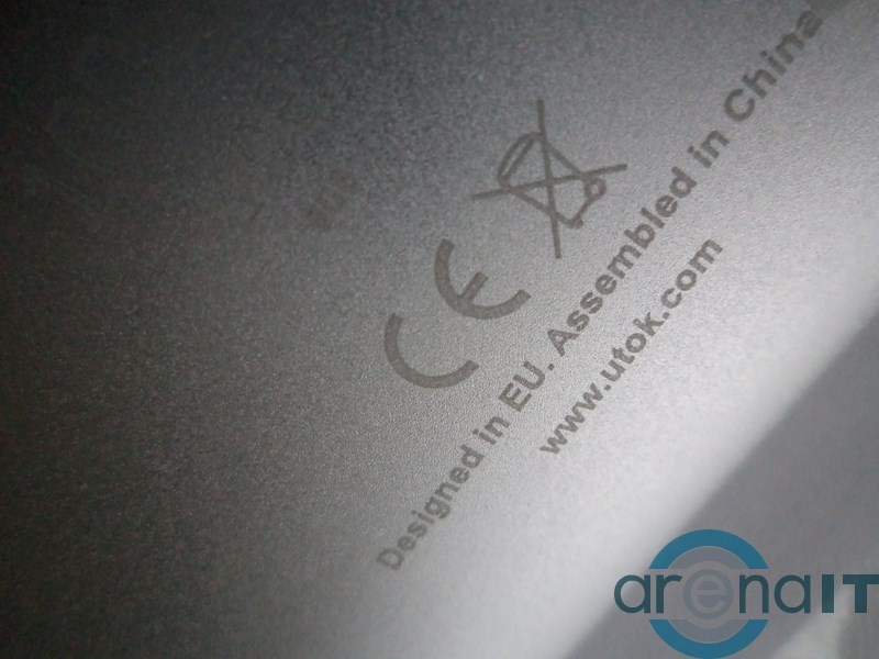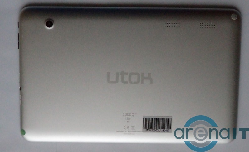Cutia este una practica, in interiorul ambalajului gasindu-se: incarcatorul (care este foarte mare), cablul USB, cablul OTG, manualul de utilizare si cam atat. Pe laterala se gasesc: butonul de pornit/oprit, butoanele de volum, portul microUSB pentru OTG, un port HDMI, un slot pentru microSD, un buton de reset si un microfon. In partea inferioara, pe carcasa metalica se gaseste sigla celor de la utok, dar si un cod de bare de dimensiuni monumentale, caruia nu-i vad rostul.
