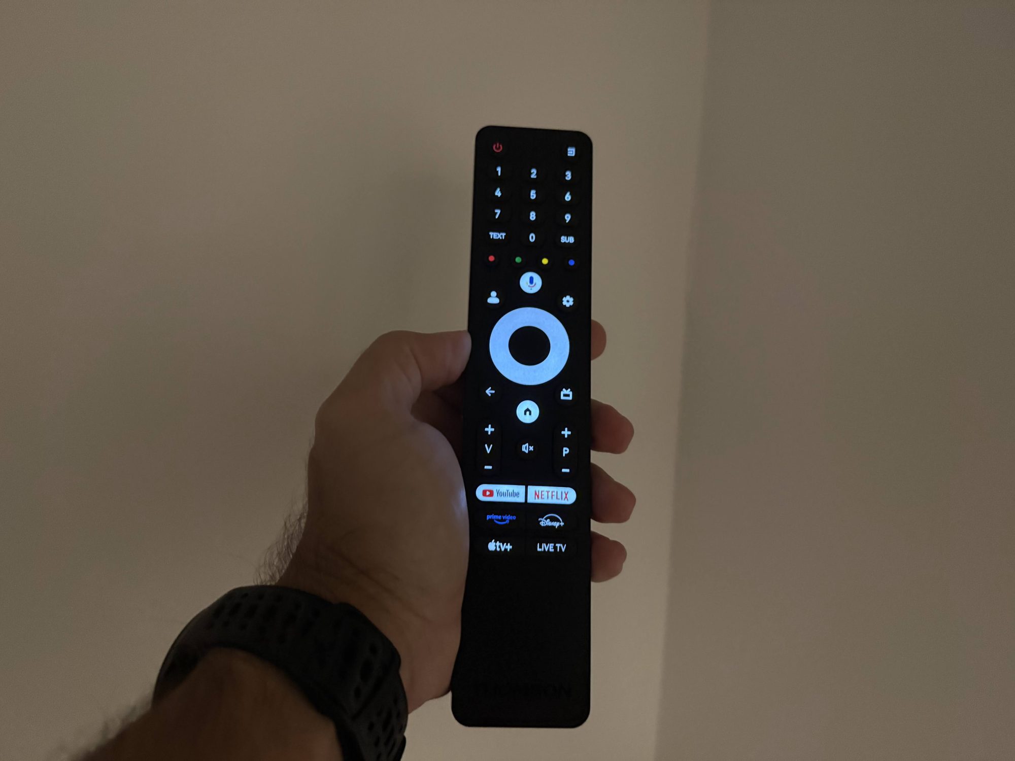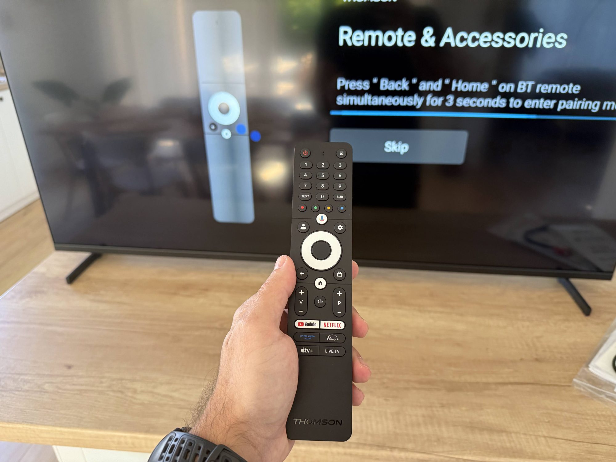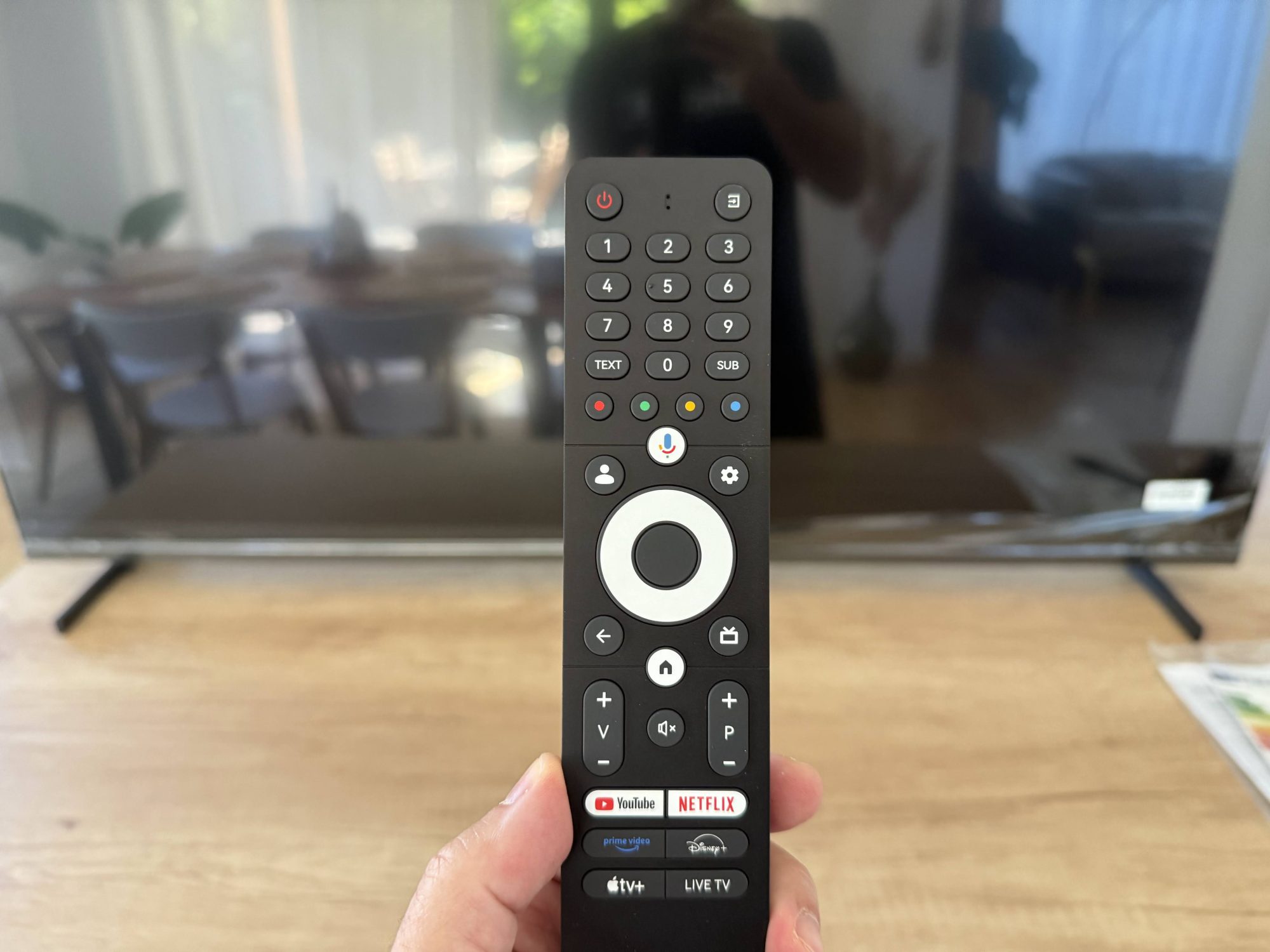Telecomanda iluminată, cu funcționare pe Bluetooth, este ergonomică, are butoane dedicate pentru aplicații populare precum YouTube și Netflix și permite controlul în orice poziție, facilitând sesiunile de vizionare nocturnă.