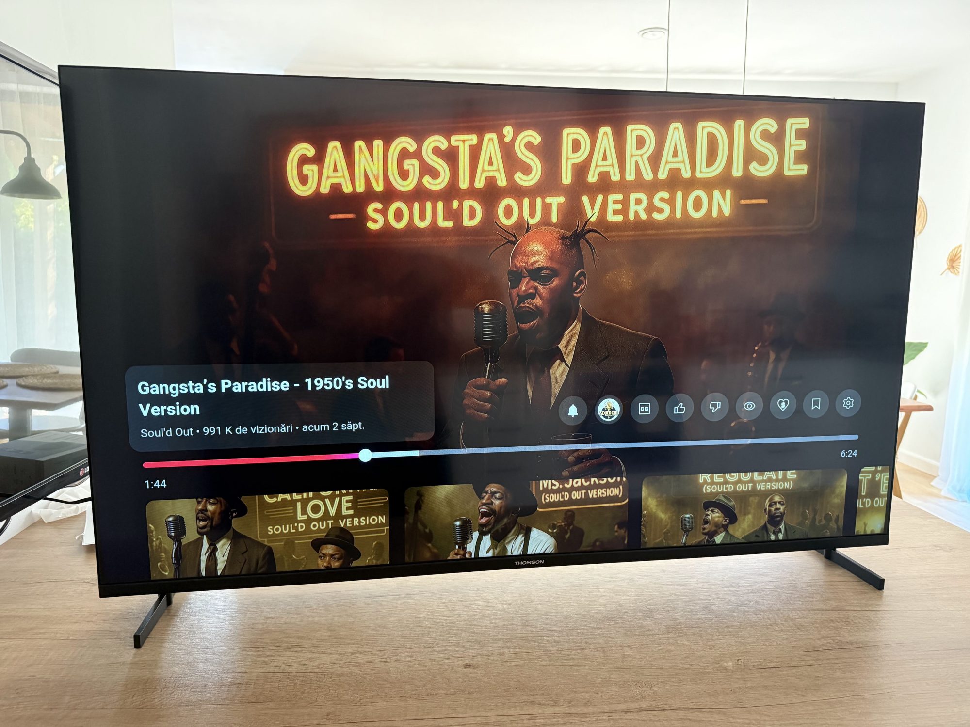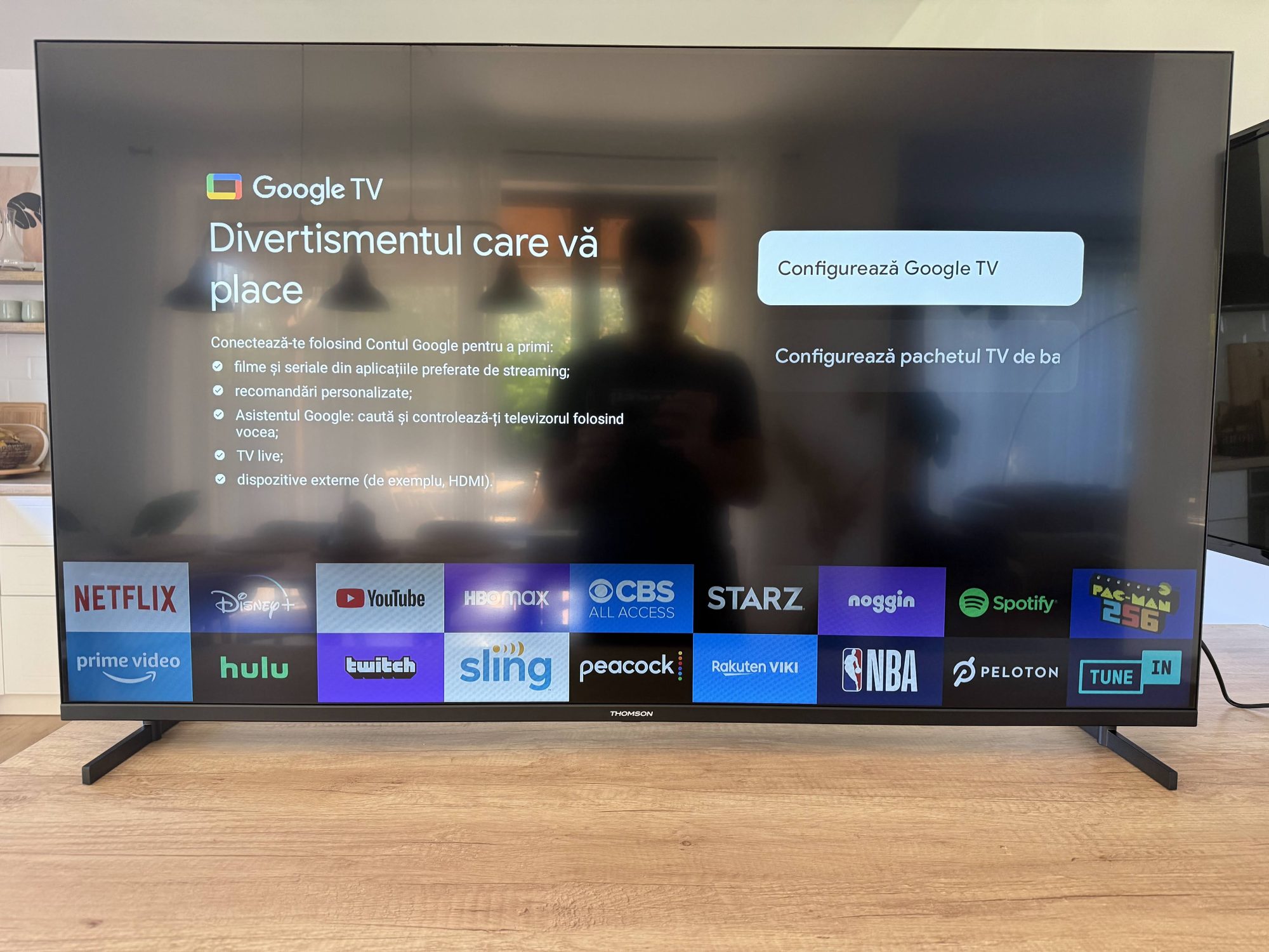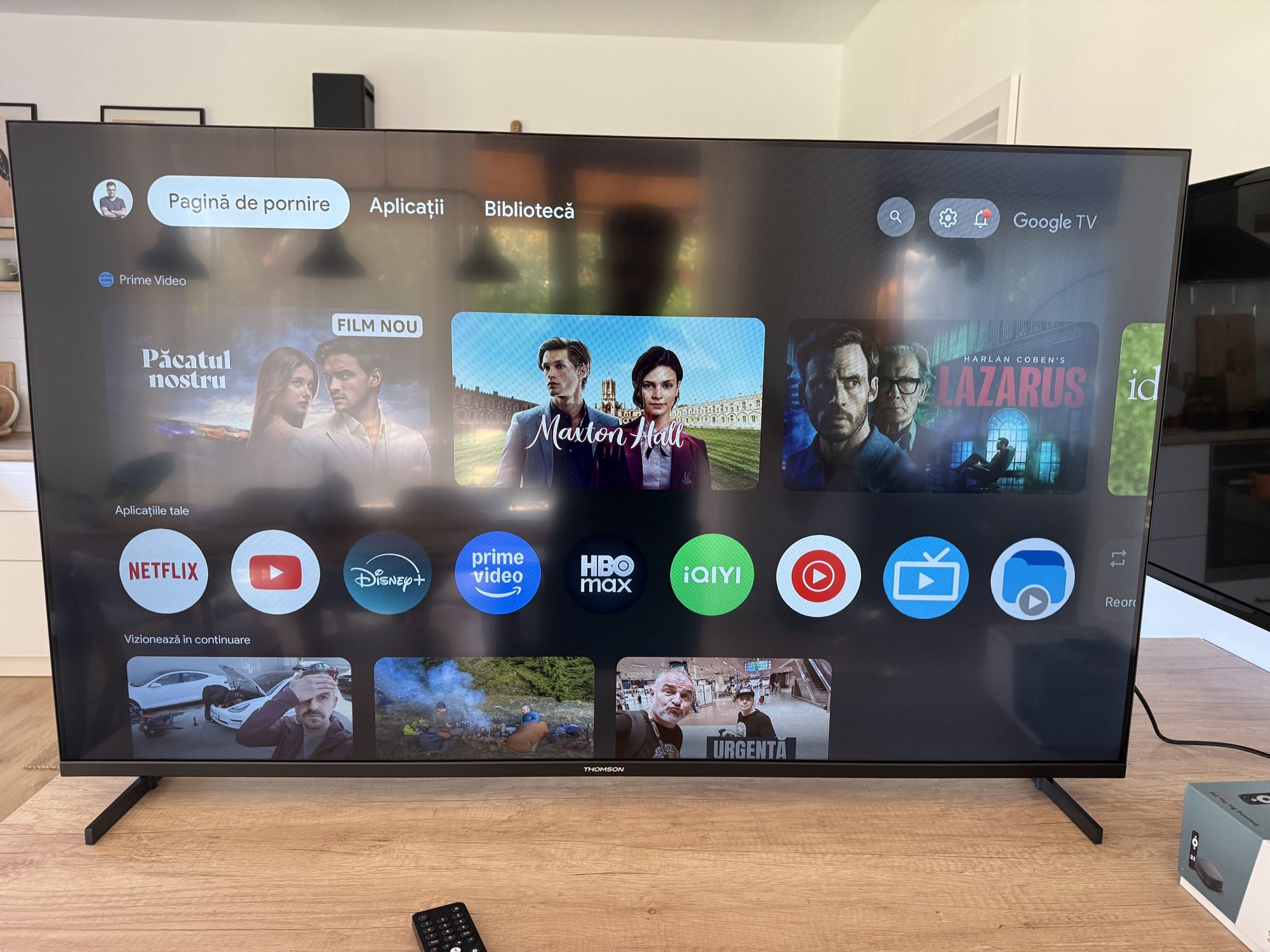 Televizorul Thomson 50UG4S14 oferă o experiență foarte bună pentru un model de buget. Instalarea și configurarea au fost rapide și intuitive, iar interfața Google TV (bazată pe Android 11) este fluidă și bine organizată. Aplicațiile preinstalate cu acces rapid de pe telecomandă includ cele mai populare platforme: Netflix, Prime Video, Disney+, YouTube, Spotify, Apple TV, iar integrarea Google Assistant permite controlul vocal simplu și eficient.
