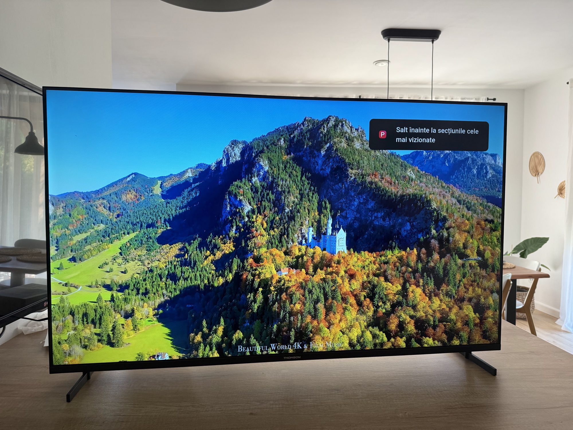 Navigarea prin meniuri este lină, cu doar mici agățări ocazionale care nu influențează în mod semnificativ utilizarea zilnică. Redarea conținutului 4K, inclusiv pe YouTube, se face fără întreruperi sau scăderi de calitate. Imaginea este clară, vibrantă și bine echilibrată datorită suportului HDR10 și tehnologiei Dynamic Noise Reduction. Sunetul în Dolby Audio cu digital surround asigură un spectru audio de calitate, iar modurile multiple audio permit ajustări în funcție de conținut.