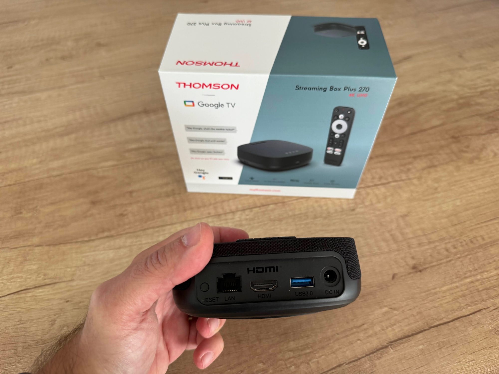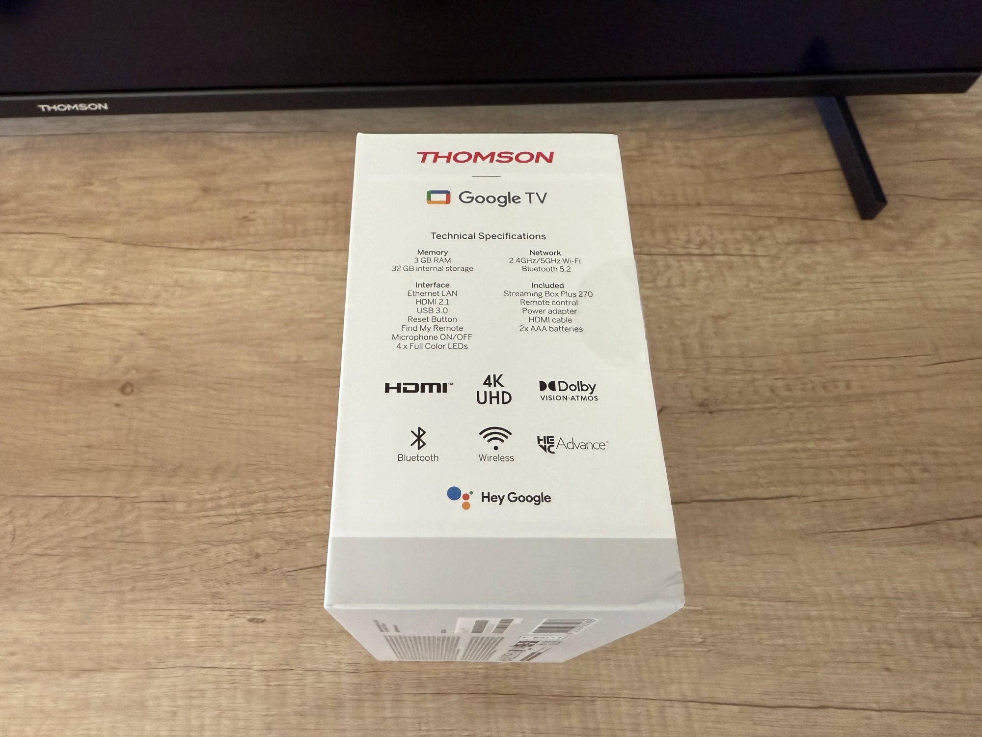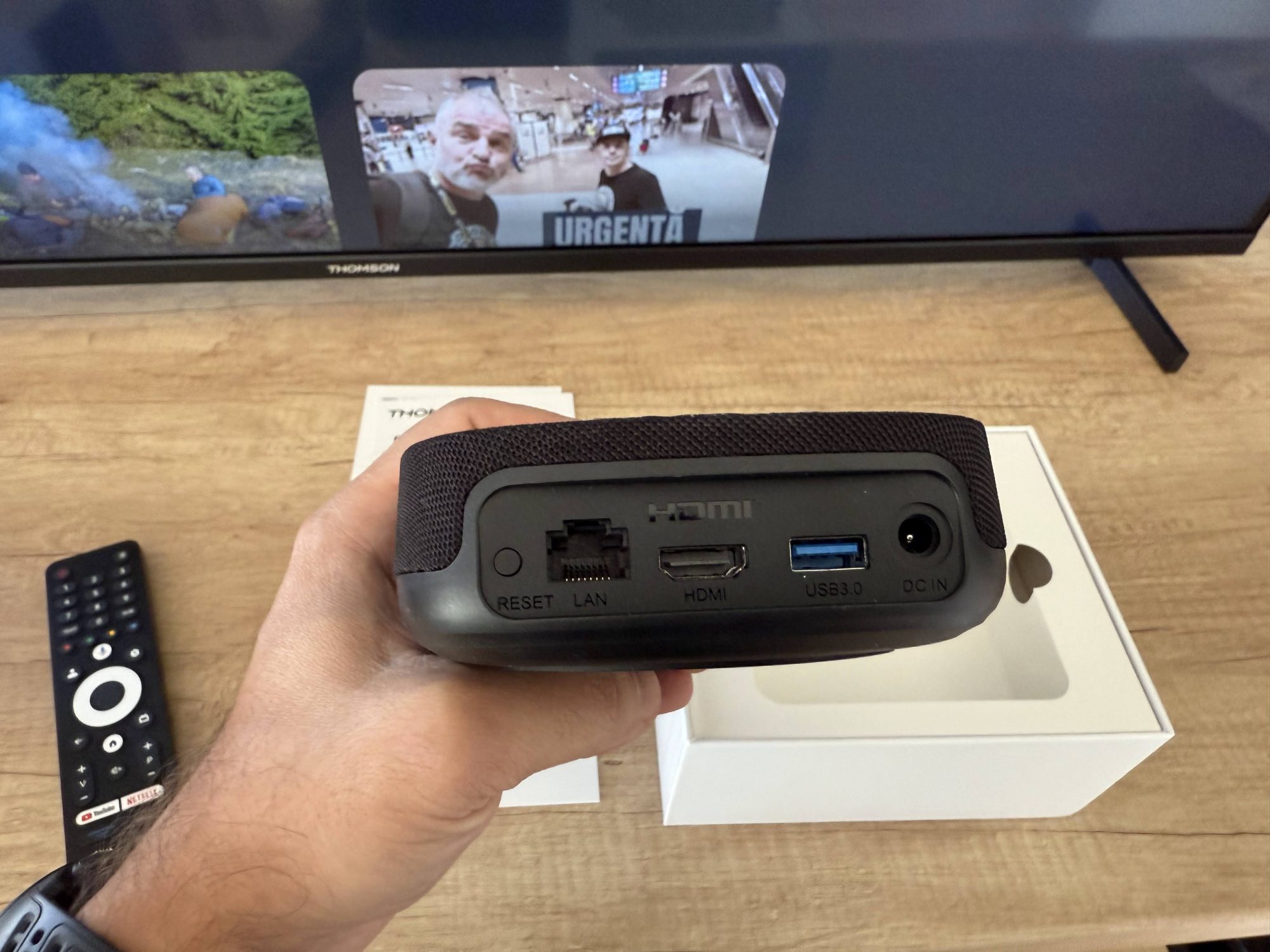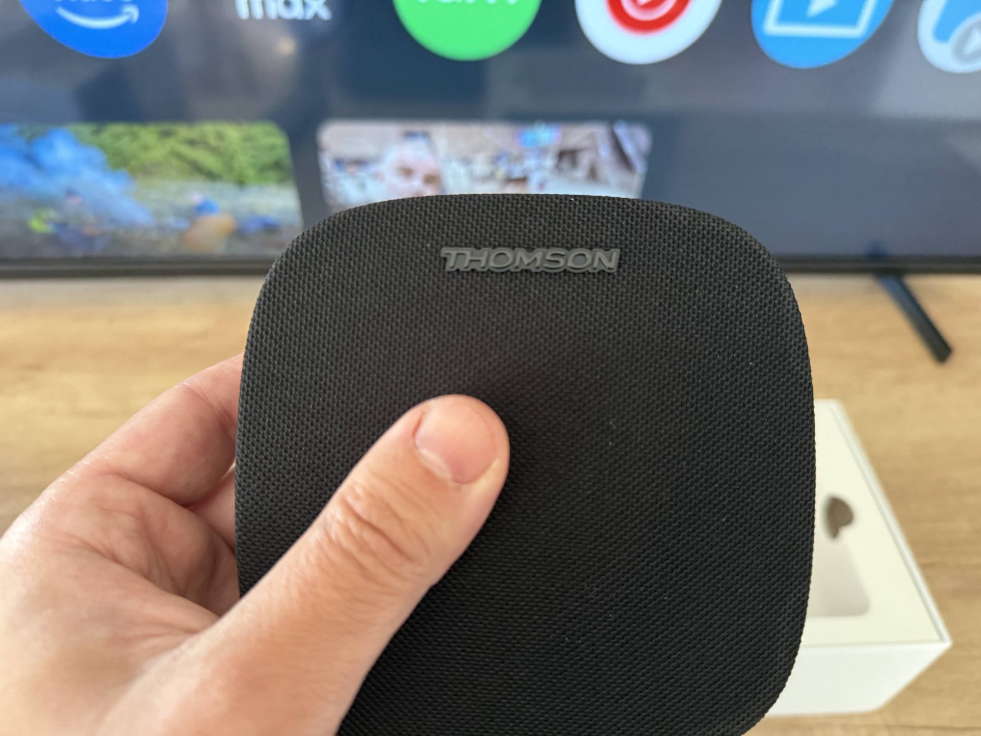 Dispozitivul vine într-un pachet complet ce include streaming box-ul, telecomandă Bluetooth și IR, cablu HDMI, adaptor de alimentare (12V/1.5A) și două baterii AAA. Design-ul este compact și elegant, cu dimensiuni de 12x12x4 cm, margini rotunjite și finisaj mat disponibil în negru sau alb. Pe partea superioară se află logo-ul Thomson discret și patru LED-uri full-color ce indică starea Google Assistant. În partea frontală regăsim butonul „Find My Remote”, pe lateral un comutator pentru activarea/dezactivarea microfonului, iar în spate porturile Ethernet, HDMI 2.1, USB 3.0, DC IN și un buton discret pentru reset.