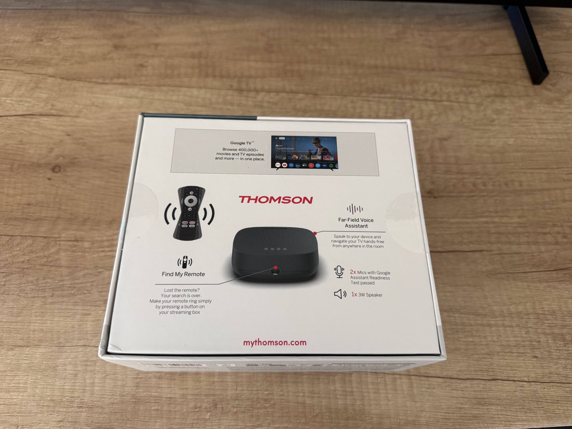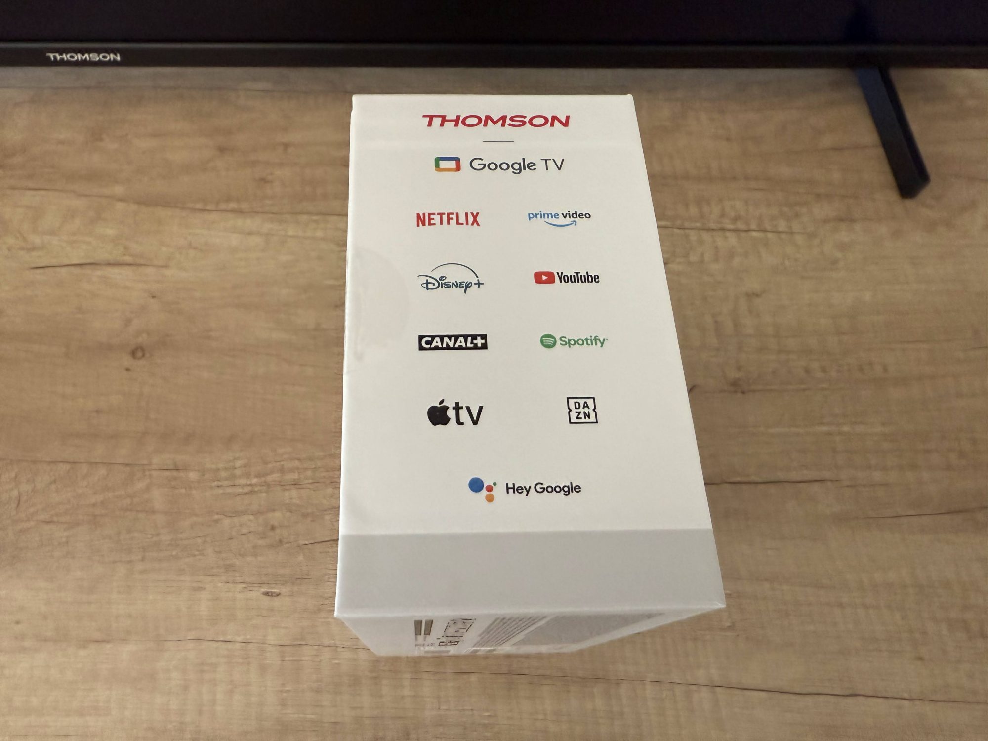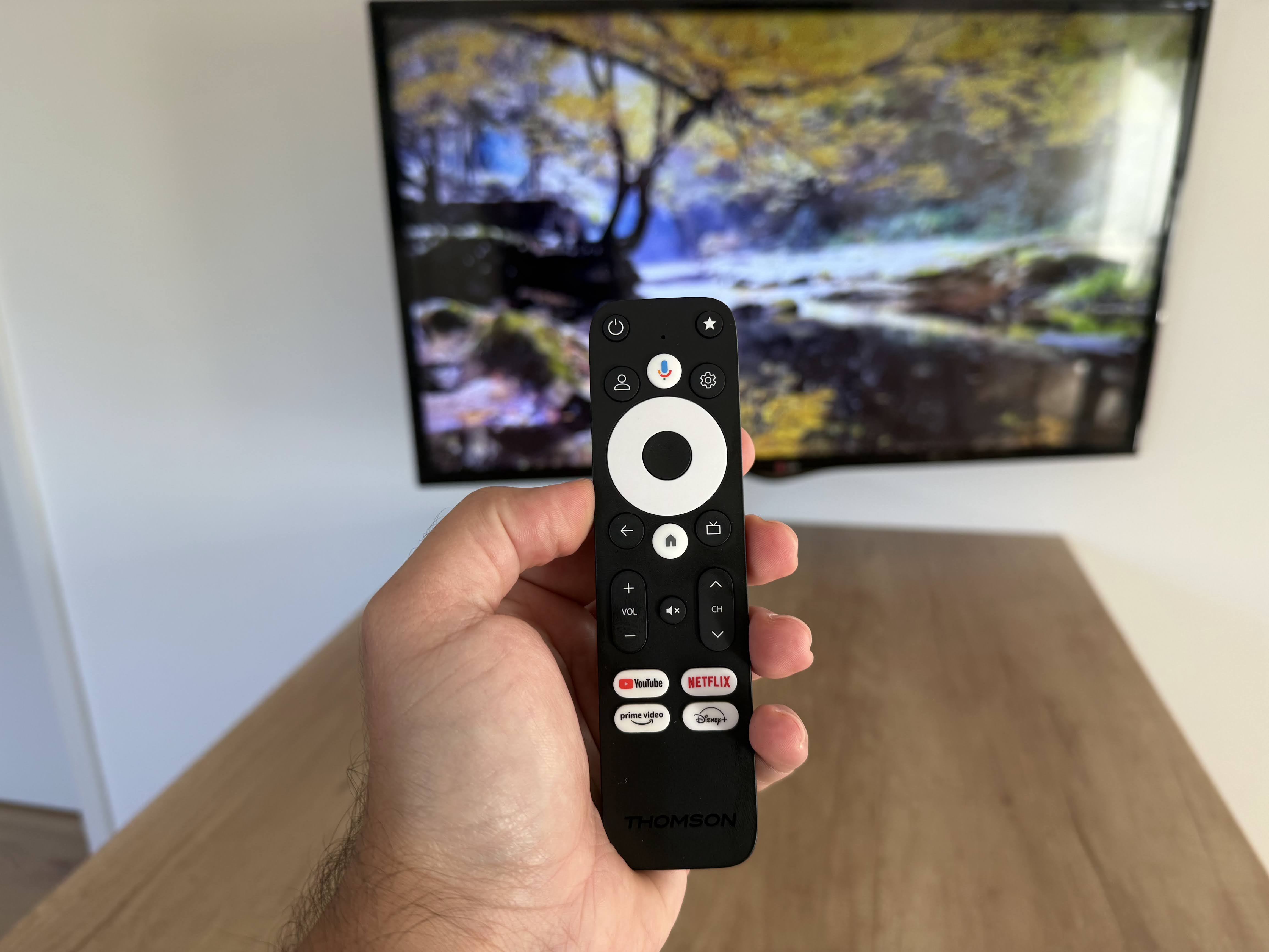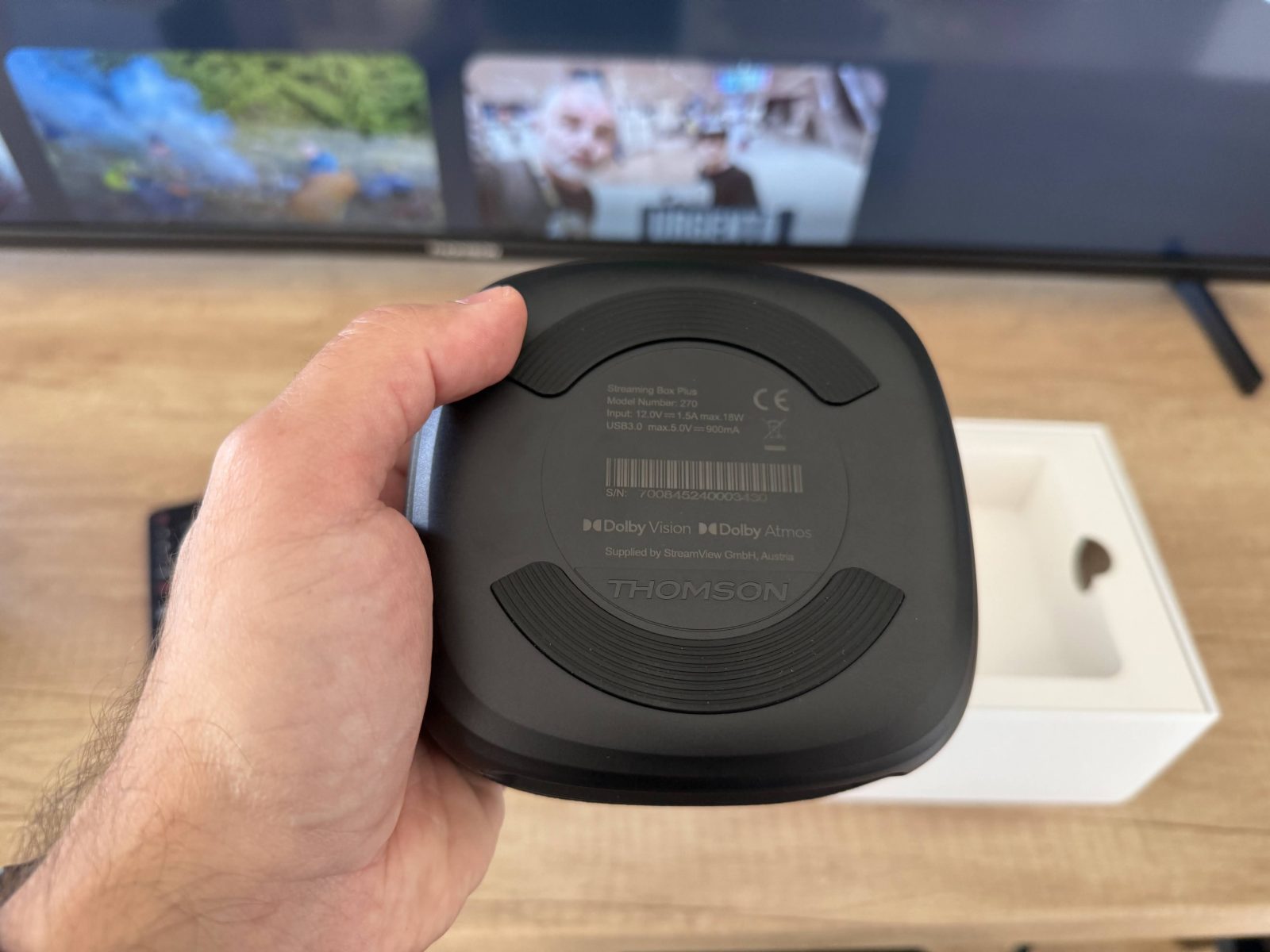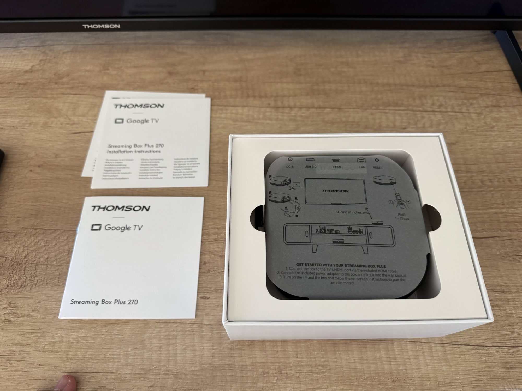 Dispozitivul vine într-un pachet complet ce include streaming box-ul, telecomandă Bluetooth și IR, cablu HDMI, adaptor de alimentare (12V/1.5A) și două baterii AAA. Design-ul este compact și elegant, cu dimensiuni de 12x12x4 cm, margini rotunjite și finisaj mat disponibil în negru sau alb. Pe partea superioară se află logo-ul Thomson discret și patru LED-uri full-color ce indică starea Google Assistant. În partea frontală regăsim butonul „Find My Remote”, pe lateral un comutator pentru activarea/dezactivarea microfonului, iar în spate porturile Ethernet, HDMI 2.1, USB 3.0, DC IN și un buton discret pentru reset.