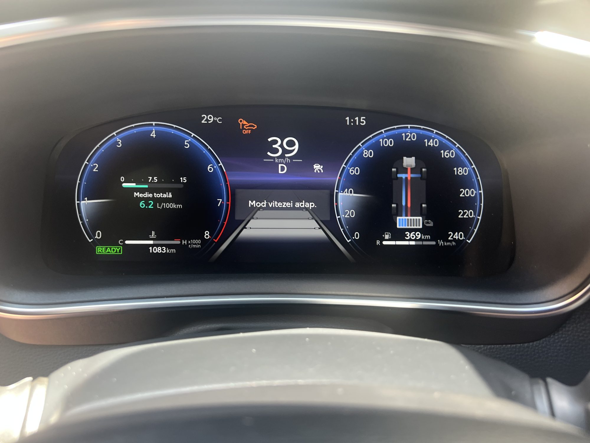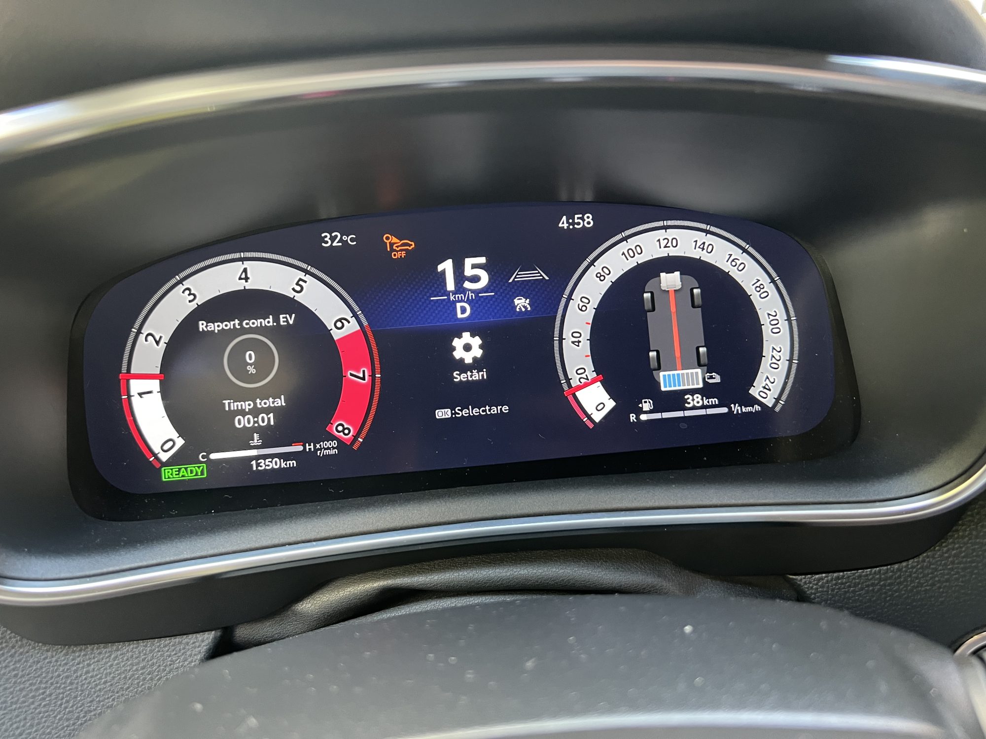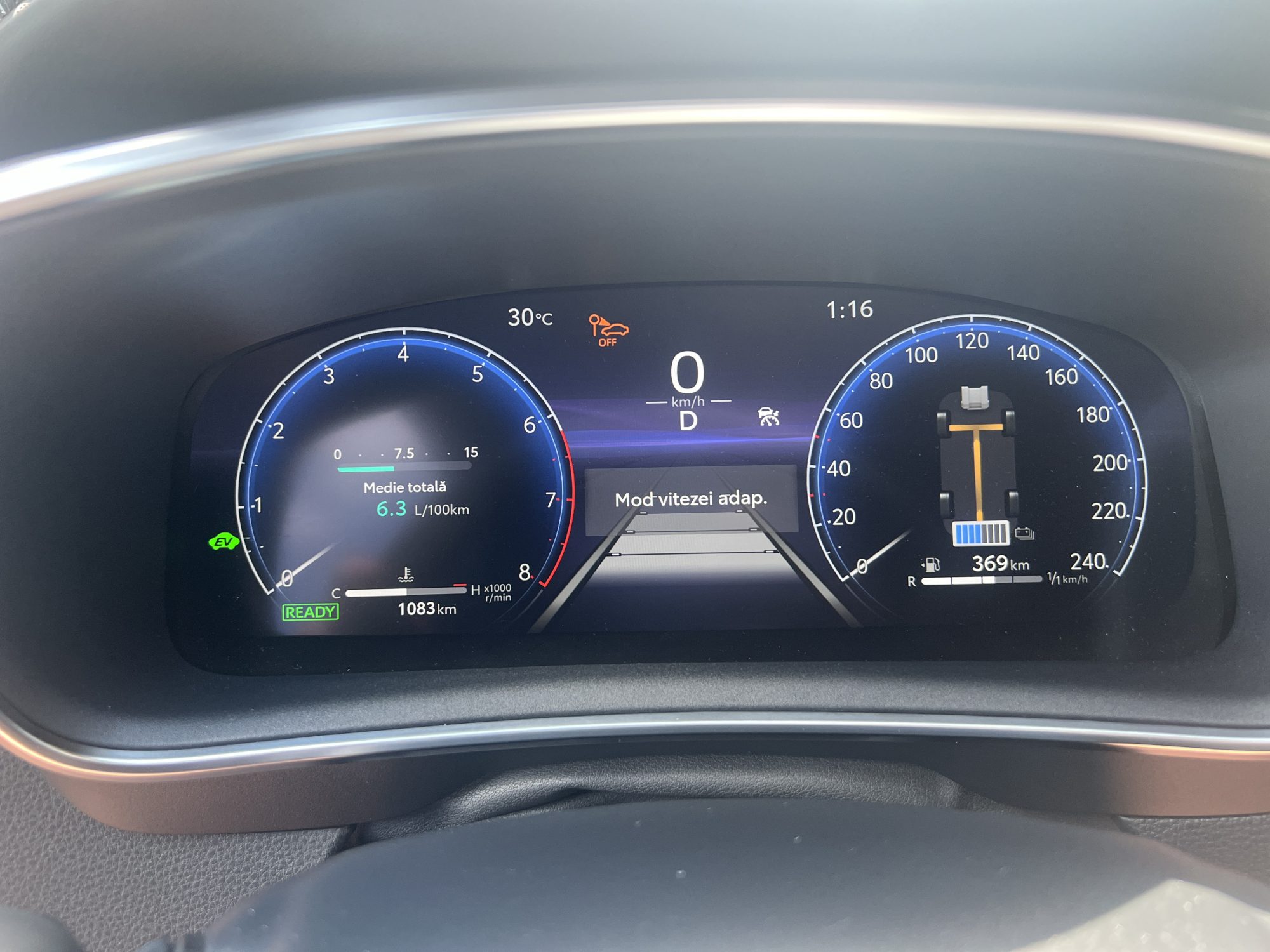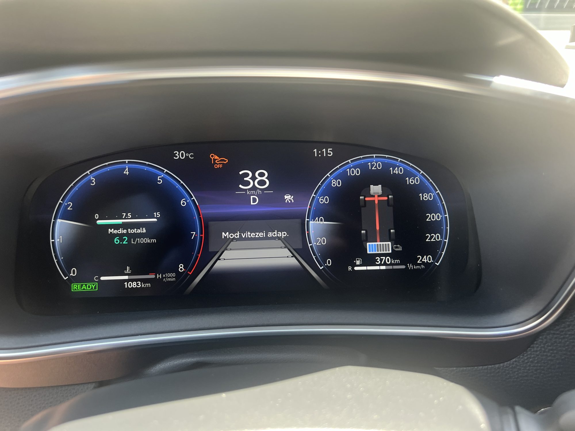 Până la 35 km/h, motorul electric preia majoritatea sarcinii dacă accelerezi ușor și bateria este suficientă. După această viteză, motorul termic începe să acționeze automat. Cu toate acestea, dacă alegi EV Mode, poți rula pe electric până la 60 km/h. Peste această viteză, ambele motoare lucrează împreună pentru accelerare, iar la viteze constante de până la 100 km/h, mașina poate rula pe electric, în funcție de nivelul bateriei.
