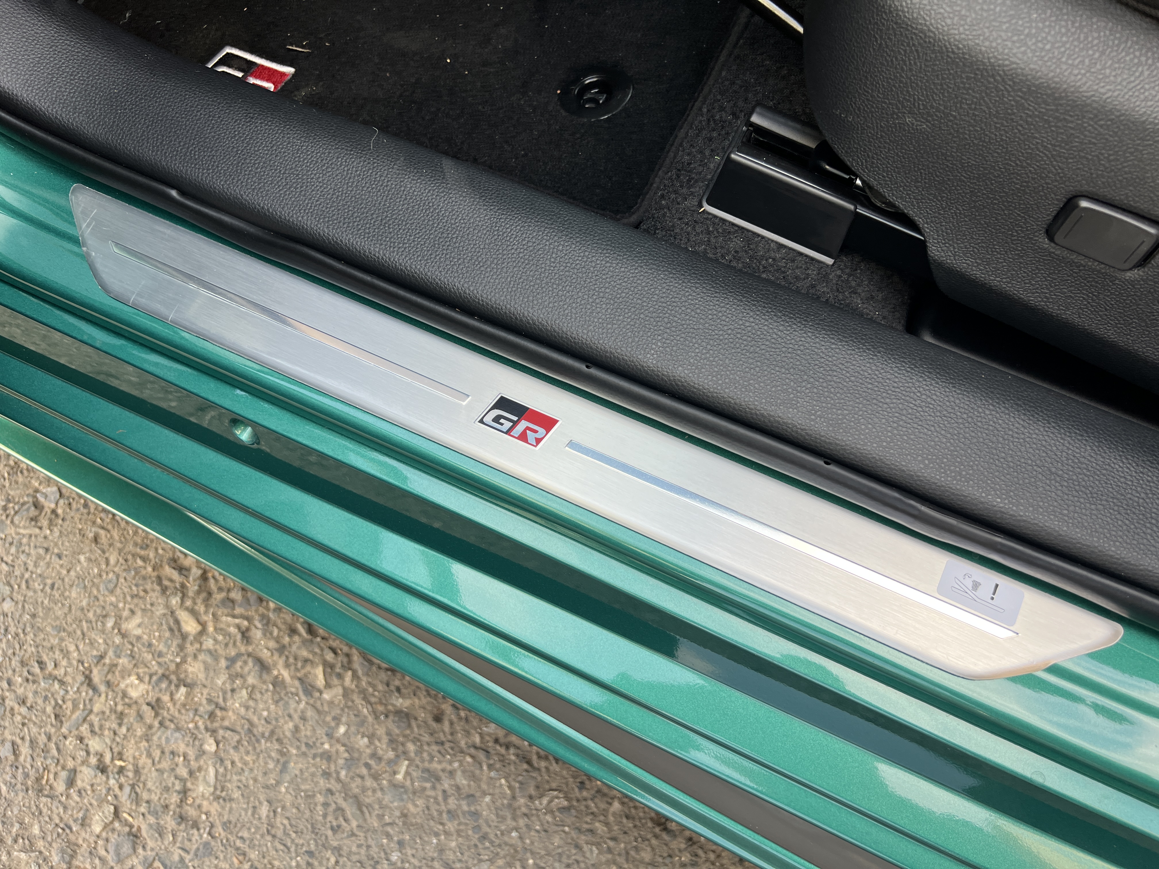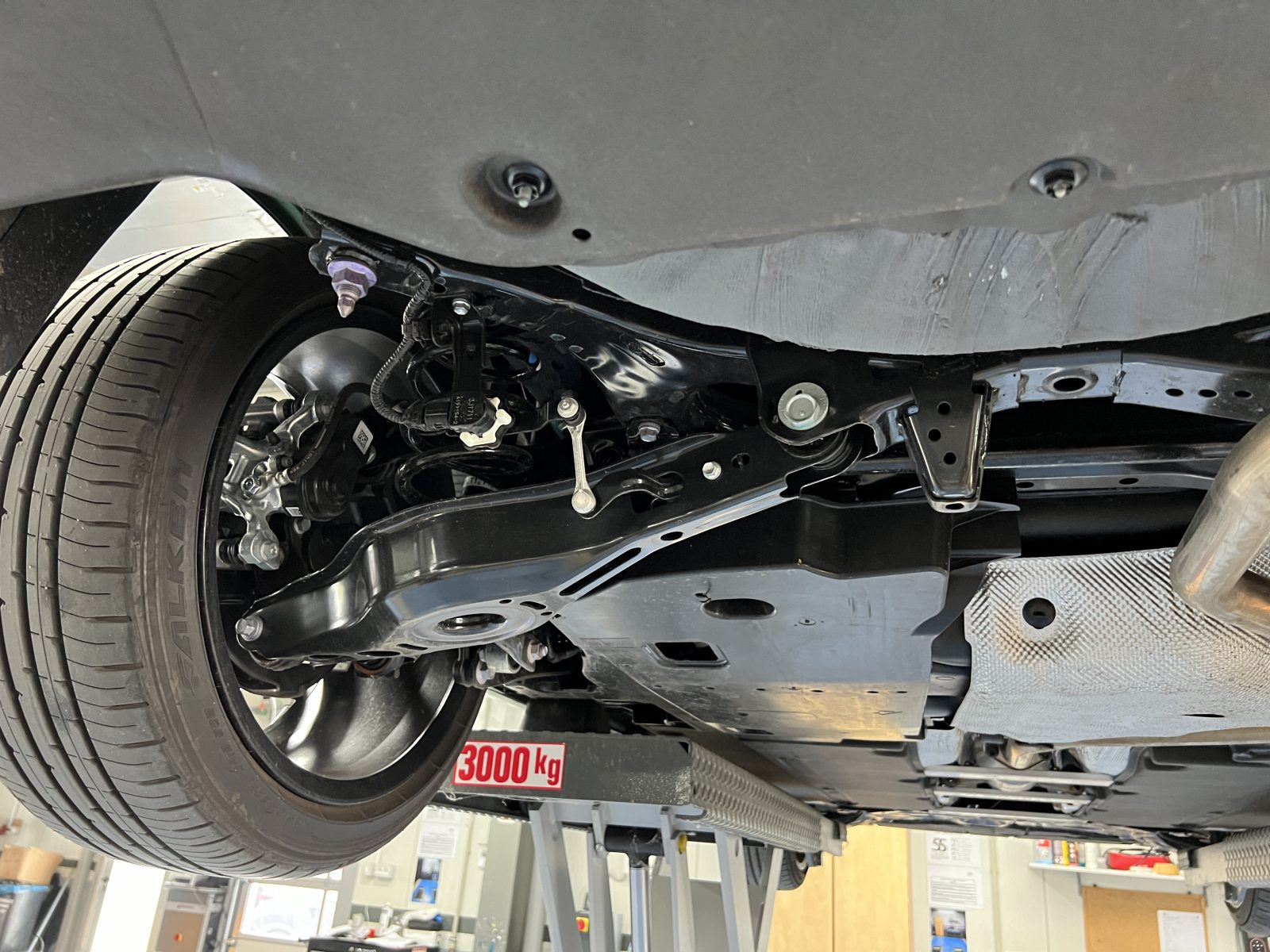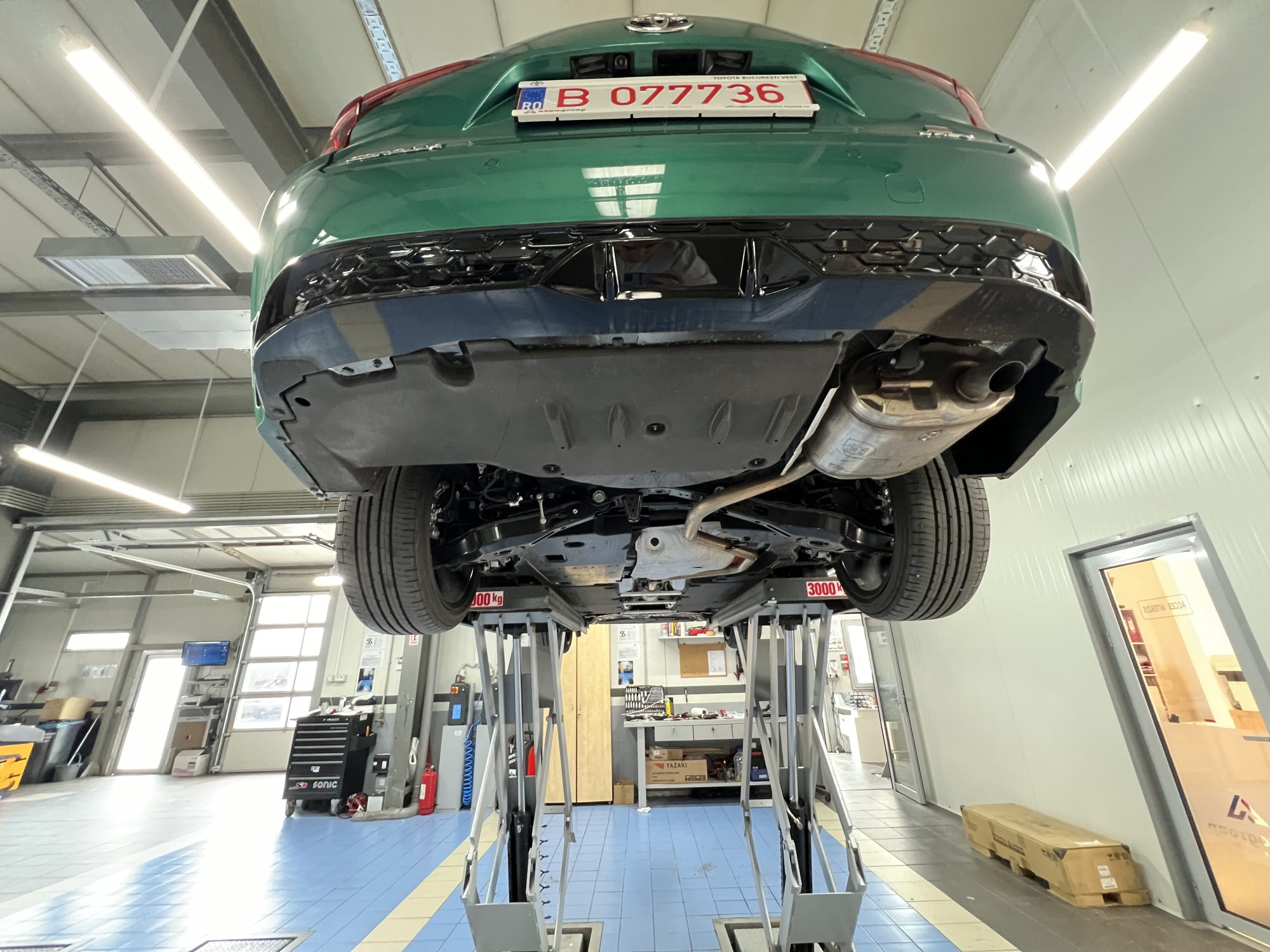 Asa la prima vedere am observat ca pivotii sunt prinsi cu surub si piulita, deci nu in nituri, si la nevoie ii poti schimba doar pe ei. Am observat si acele traverse de la mijlocul masinii, disponibile doar pe GR Sport din cate am inteles, care fac ca masina sa fie mai inchegata, mai stransa, mai stabila pe sosea.