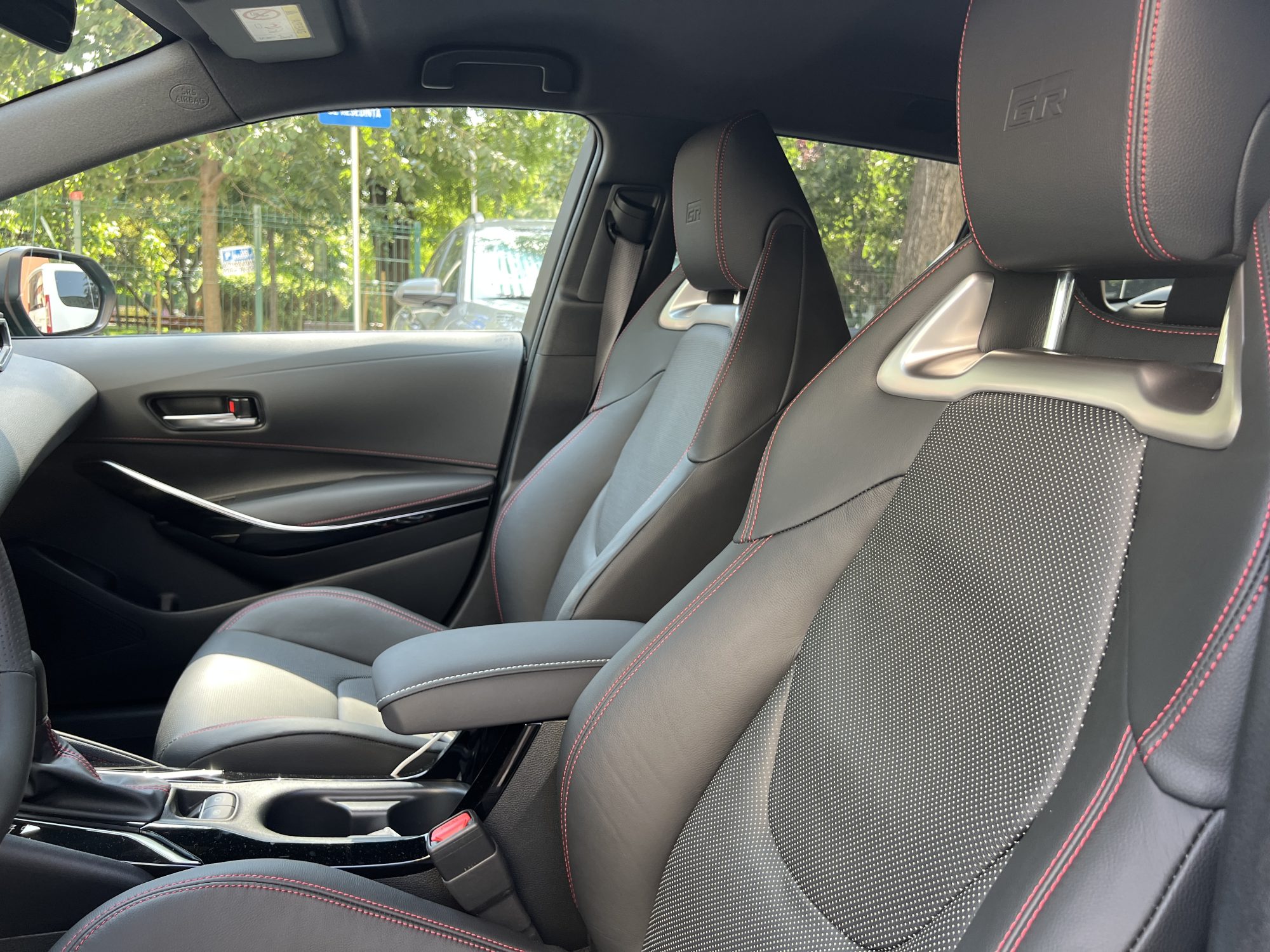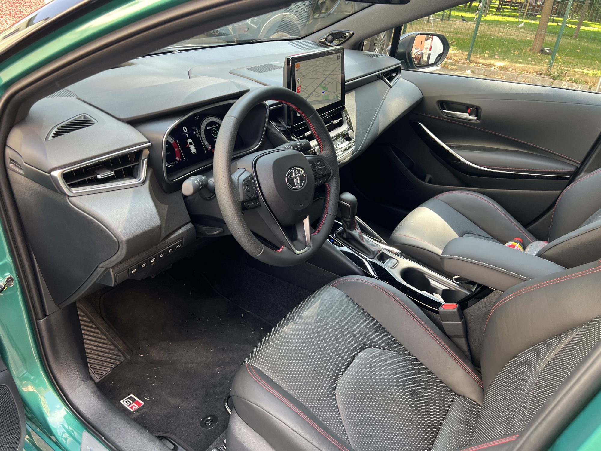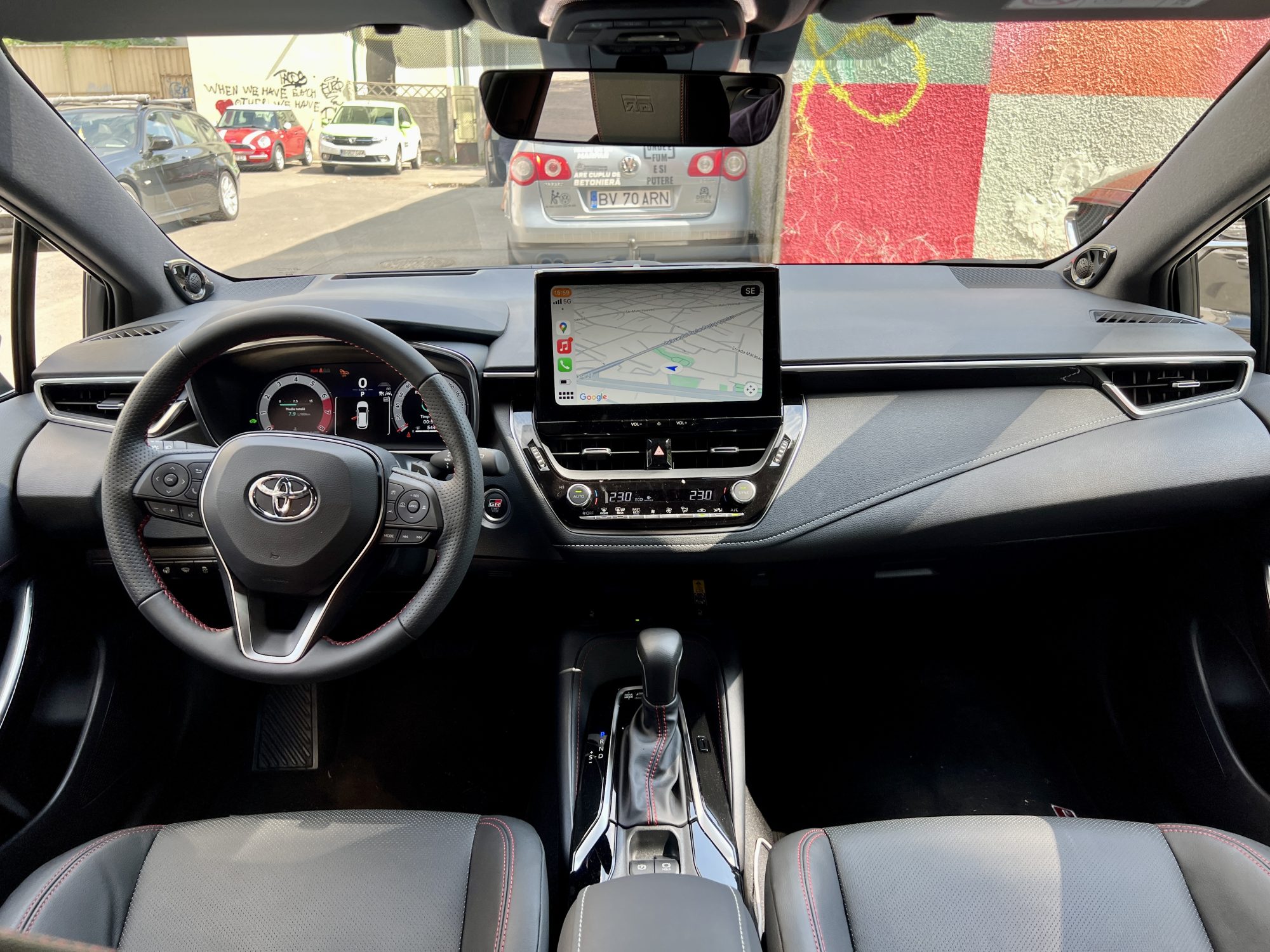 Interiorul Toyota Corolla GR Sport 2024 este caracterizat de un bord solid, majoritatea zonelor fiind îmbrăcate în materiale moi, cu doar câteva părți din plastic dur. Gurile de ventilație sunt înconjurate de un inel cromat care traversează bordul, iar în centrul acestuia se află o tabletă de 10 inch cu un sistem multimedia avansat, bazat pe procesor Nvidia și Android Automotive.