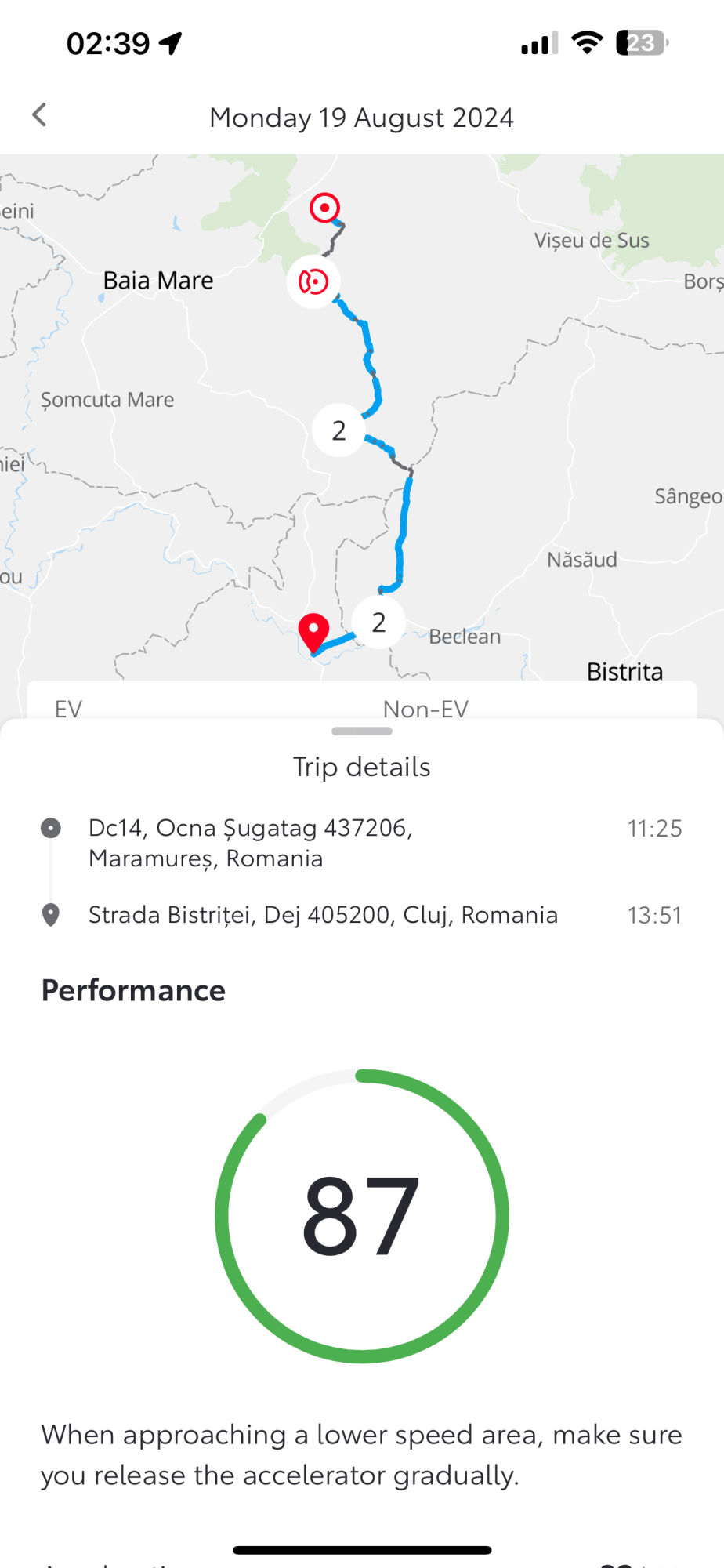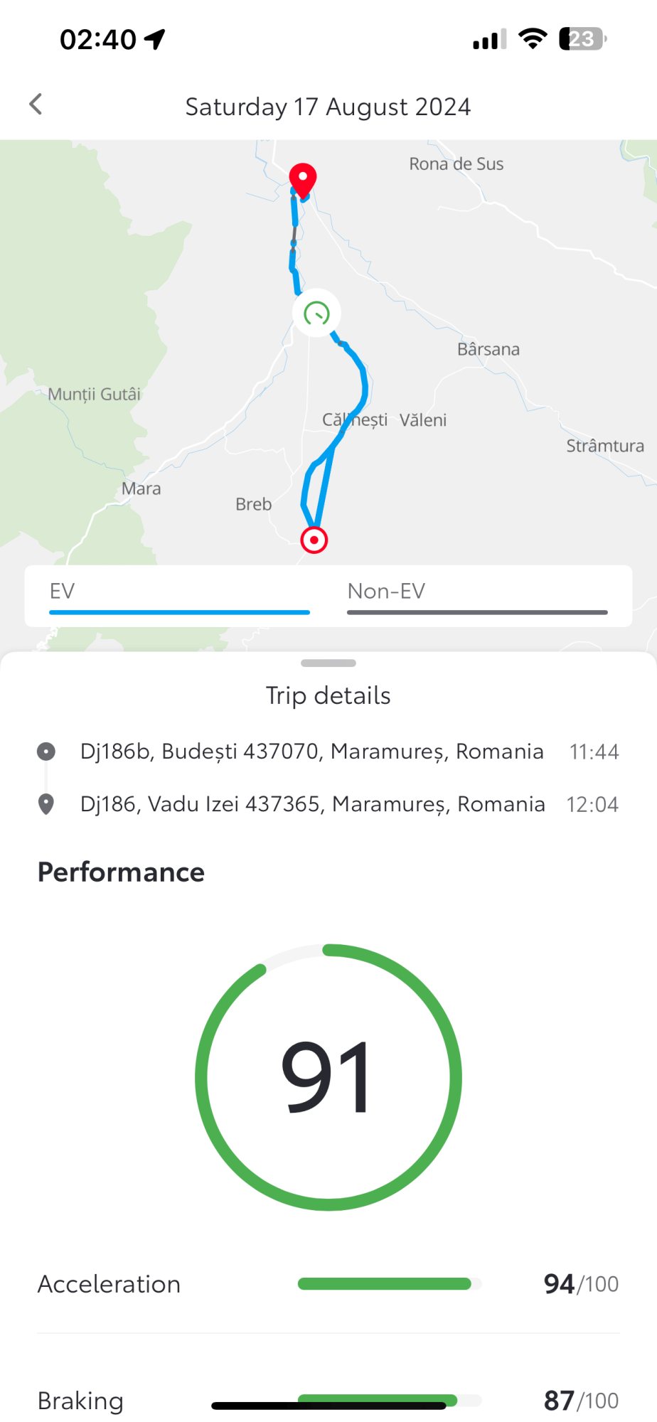 Într-un traseu de 10 km prin București, mașina poate parcurge aproximativ 70% din distanță pe electric, adică 7 km, iar restul de 3 km pe motor termic. Totuși, acest raport nu este constant; în funcție de condițiile de drum, vei alterna între modurile electric și termic. Hărțile de mai jos arată distanțele parcurse în mod EV (albastru) și în mod termic (negru).