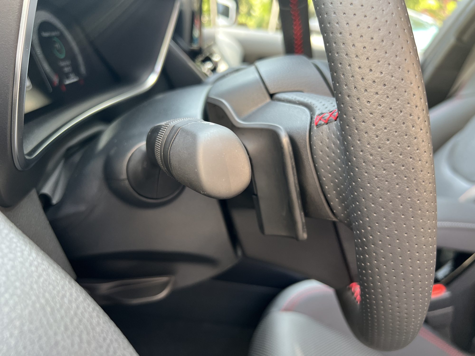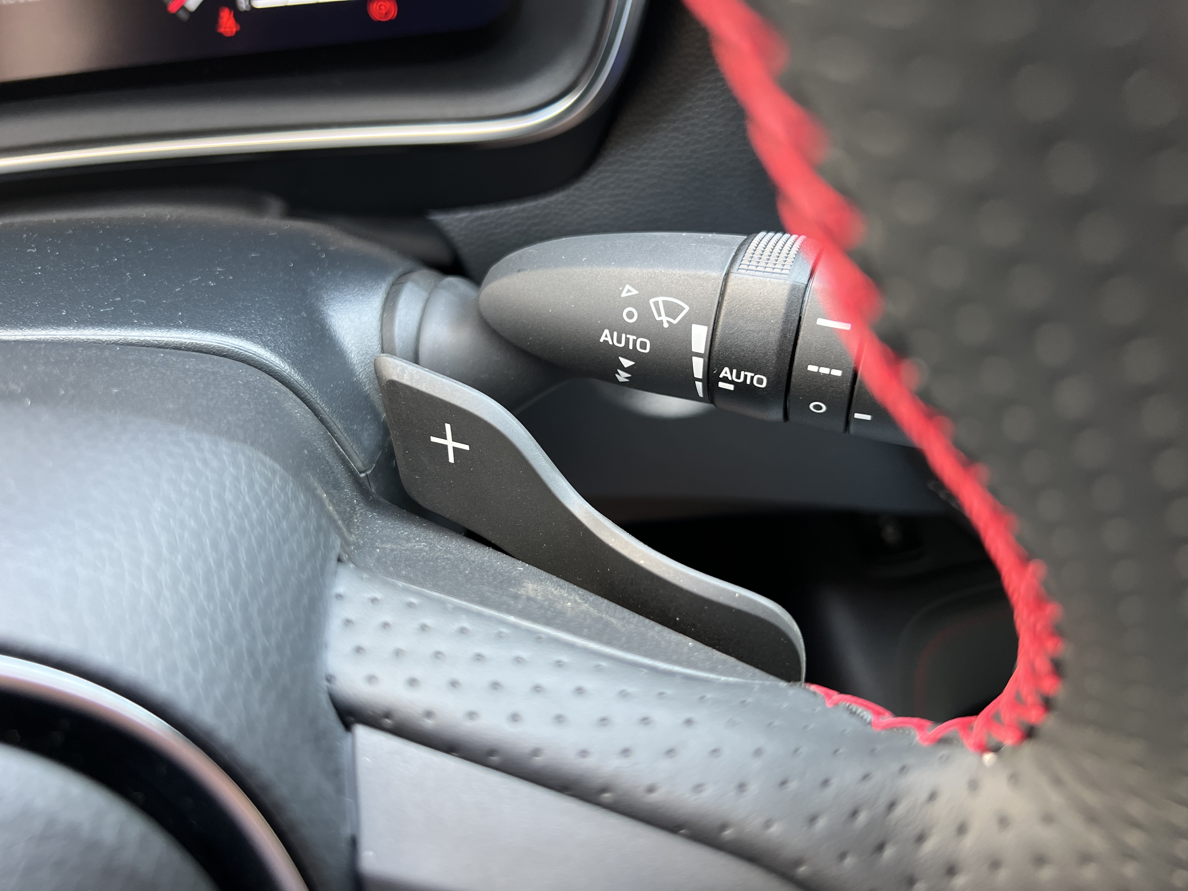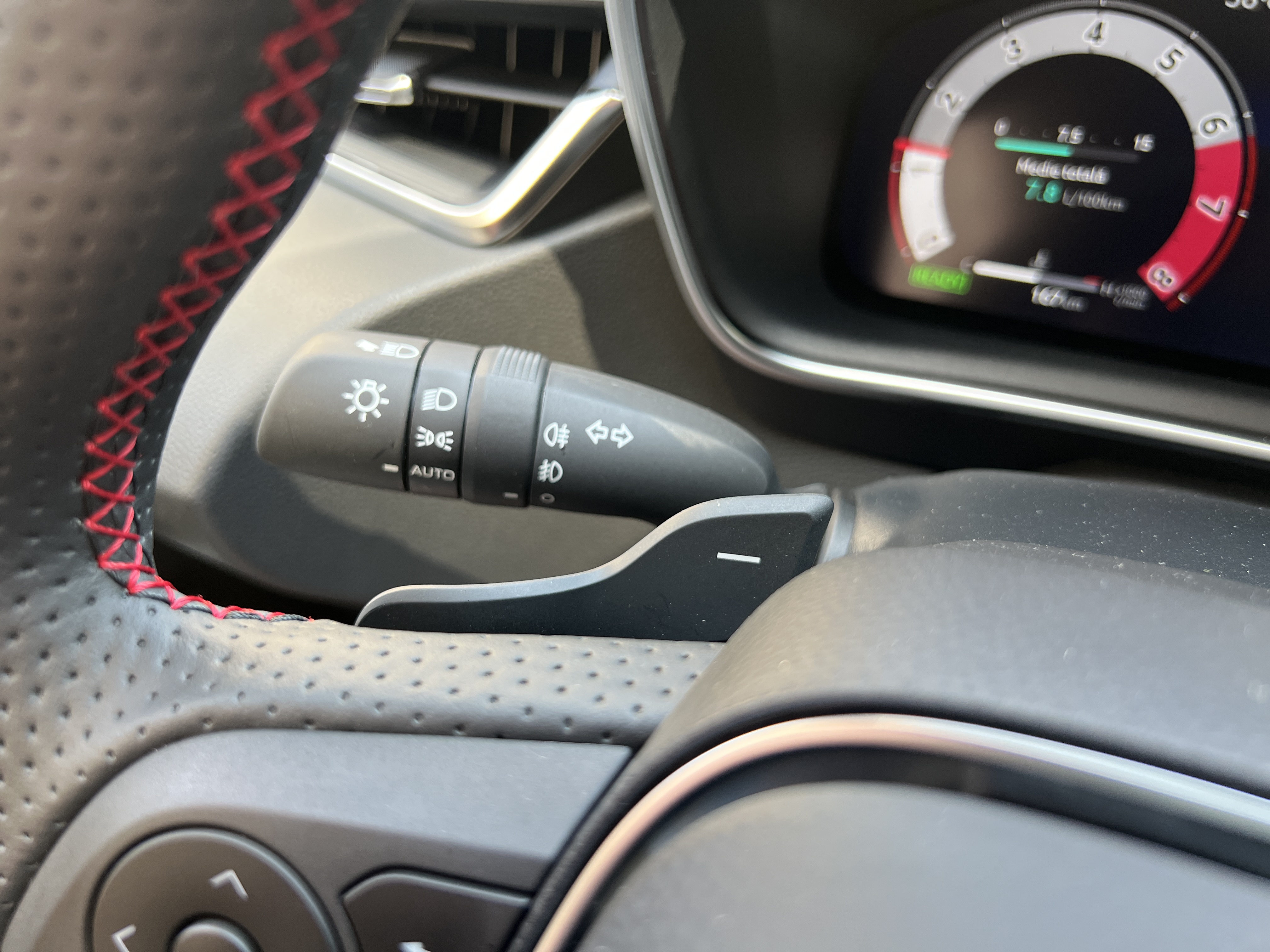Sistemul de climatizare este fizic, cu butoane dedicate, spre deosebire de alte modele unde este integrat în tabletă, ceea ce este un aspect pozitiv pentru mine. Volanul, complet îmbrăcat în piele cu inserții perforate și cusături roșii, este plăcut la atingere și dotat cu multiple comenzi pentru pilotul automat, apelare, volum, control multimedia și setări.