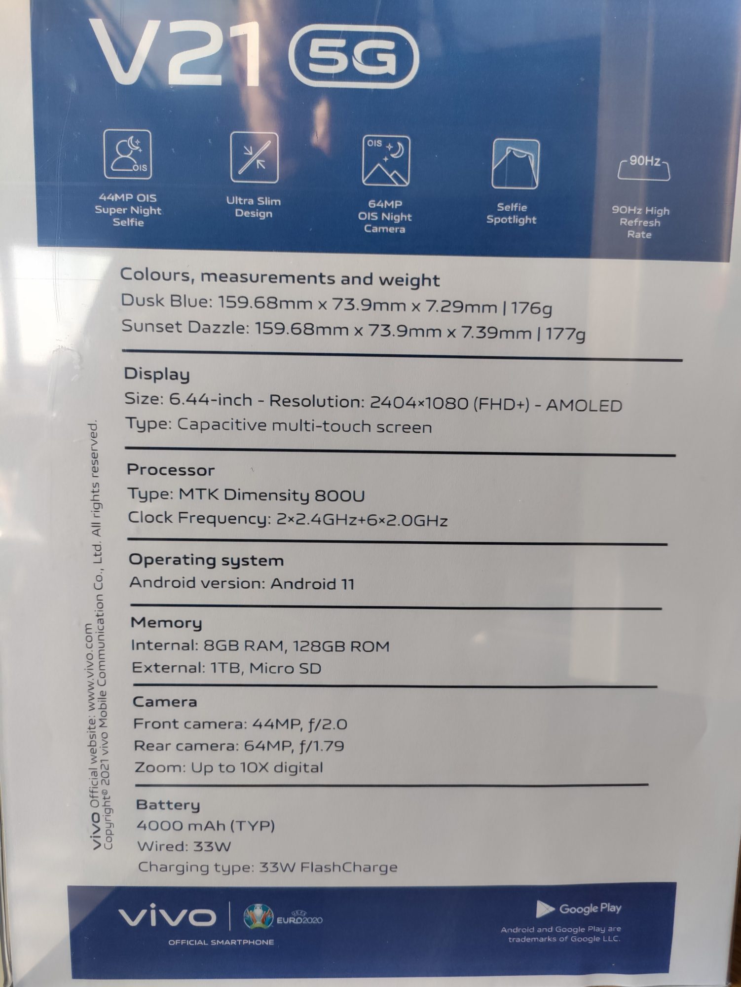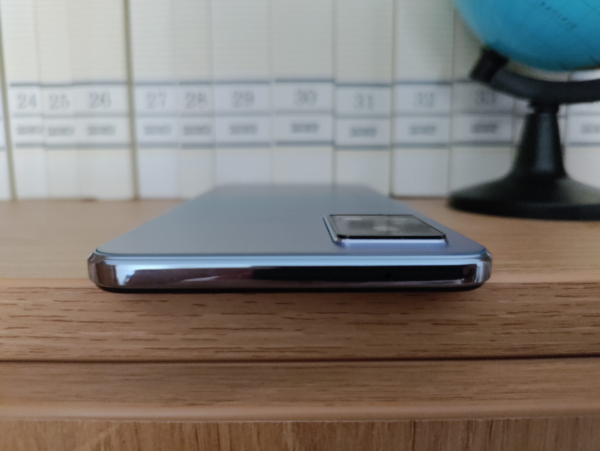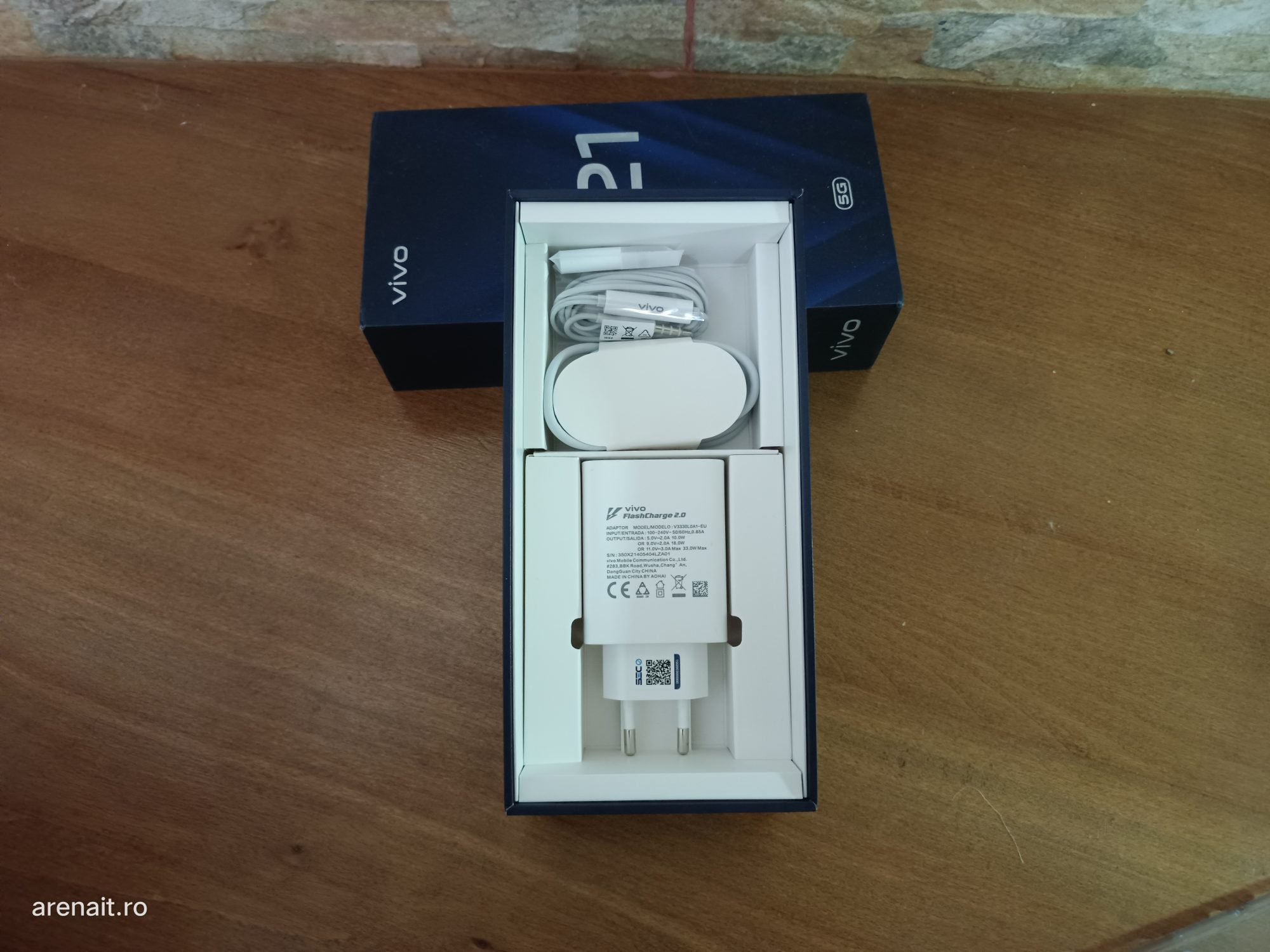 Marginile telefonului sunt extrem de mici, aproape insisesizabile. Camera selfie este poziționată central, în display. Deasupra ei avem difozorul de apel. Pe spate avem logo vivo și datele modelului, precum și modulul de cameră ((același design și aceeași așezare ca la X60 PRO 5G sau X51 5G). Acesta este situat în partea stângă sus și nu este prea ieșit în evidență. Ambele butoane – cel de pornit/oprit și cel de volum – sunt situate pe lateral dreapta. În partea superioară avem antena pentru semnal și tăvița SIM, iar în cea inferioară se află difuzorul audio, mufa USB-C pentru încărcare și cea audio, de tip jack.