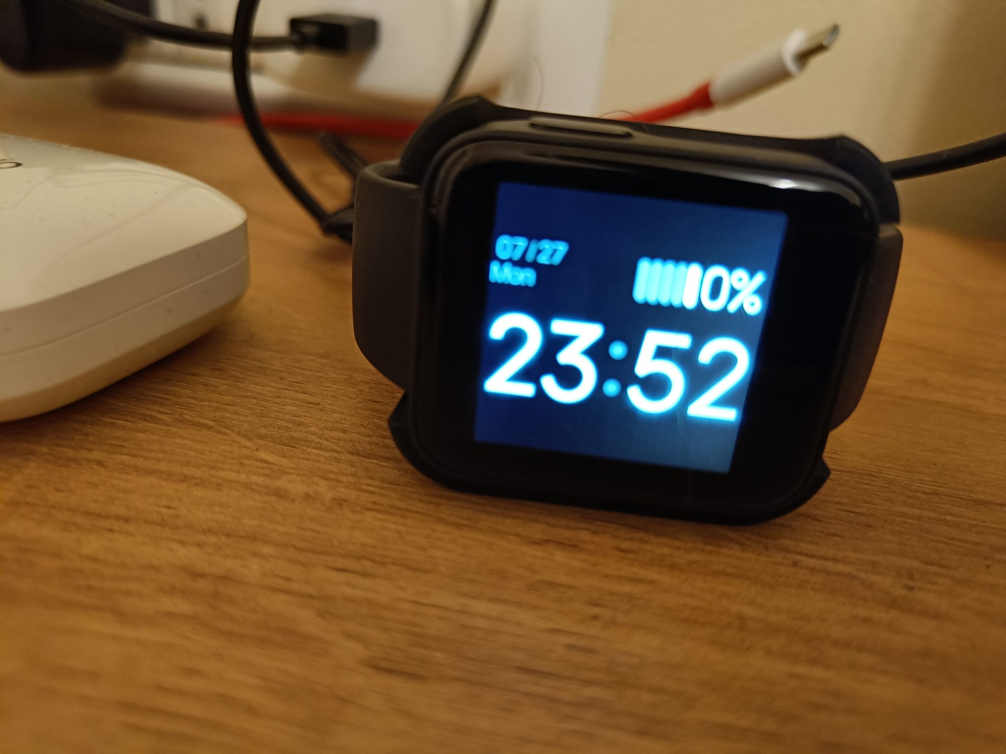 În cam două pentru un ciclu de încărcare, iar în acea perioadă îl poți întoarce pe o parte și display-ul se rotește și el. Practic devine un ceas de birou. Cute, cum ar zice fiică-mea!