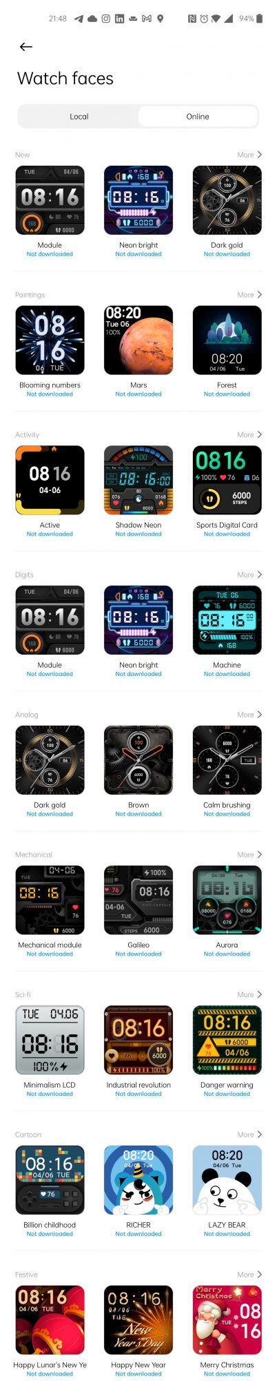 Sunt disponibile peste 100 de fețe, unele care imită ceasurile analogice, unele cu personaje de prin desene, altele mai futuriste sau mai clasice etc. Ai de unde alege, de data asta. Eu am preferat ceva simplu, care chiar cred că aduce a iWatch.