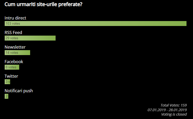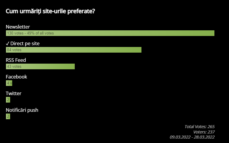 În altă ordine de idei, se pare că trei ani au fost destui pentru a schimba opțiunile cititorilor. De ce spun asta? Pentru că, dacă în 2019 majoritatea, adică 65% din respondenți, preferau să intre direct pe site preferat, acum doar jumătate dintre ei mai fac asta. În același timp, cei care preferă newsletterul sunt predominanți azi (aproape jumătate), față de 9%, anterior. De asemenea, și cei care urmăresc feed-urile RSS aproape s-au dublat ca procent – de la 9% la 16%. Cu toate acestea, numărul urmăritorilor de pe Facebook s-a înjumătățit, iar cei de pe Twitter au rămas cam tot pe acolo. Utilizatorii care preferă metoda de notificare push sunt la fel de puțini ca și în trecut.
