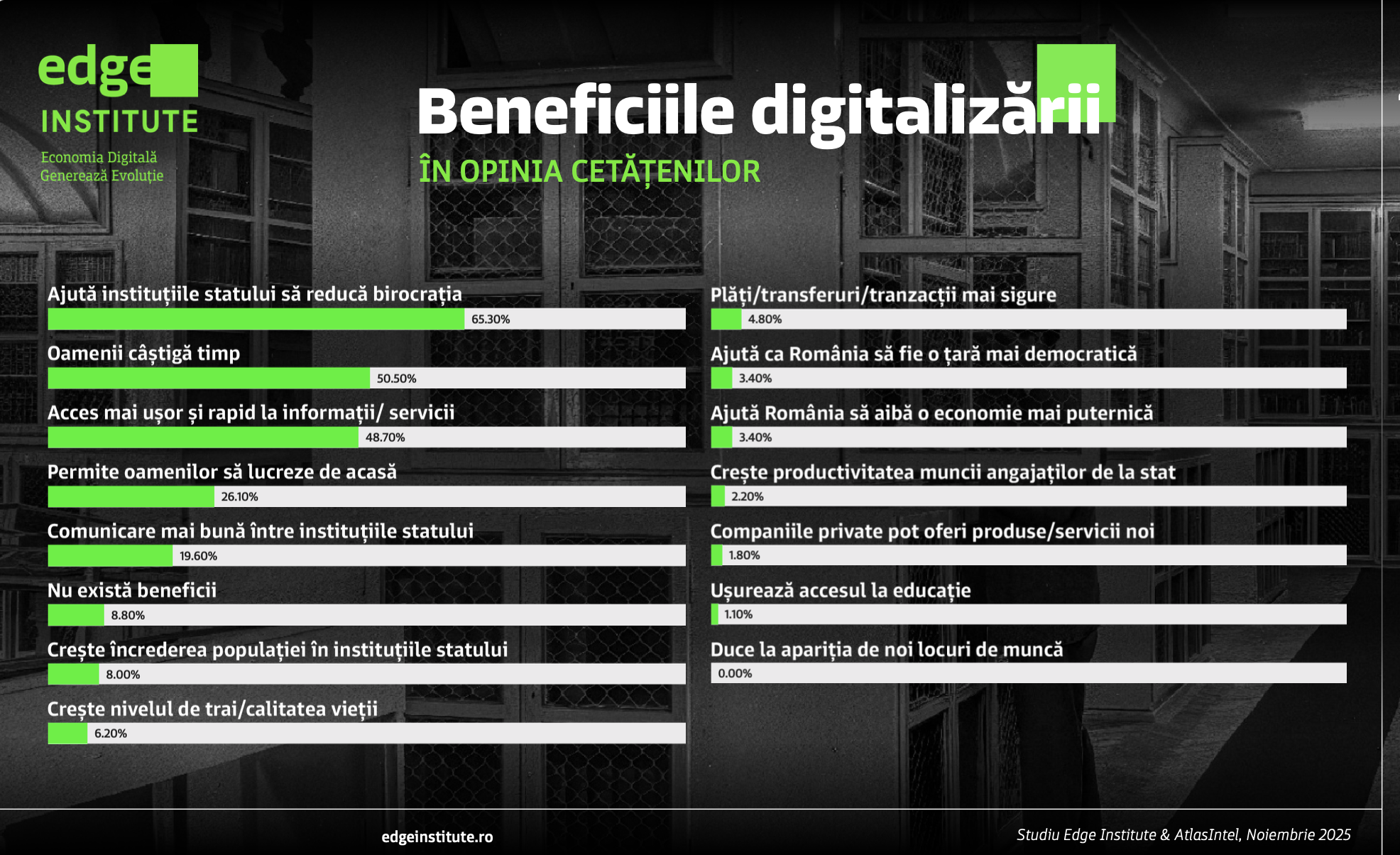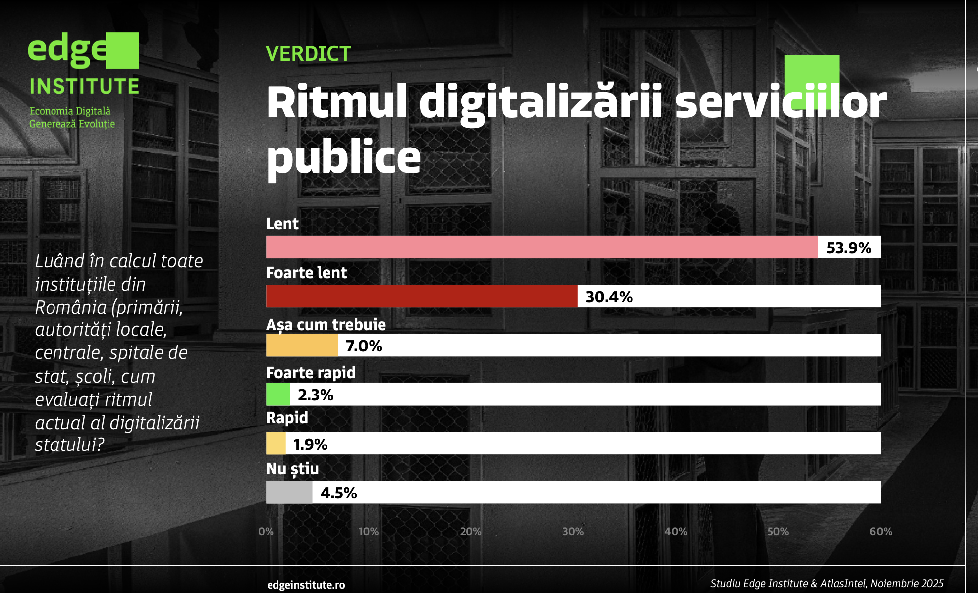 În cadrul Summitului pentru Guvernanță Digitală 2025, desfășurat la Palatul Cotroceni sub Înaltul Patronaj al Președintelui României, Edge Institute a prezentat un studiu amplu despre cum văd românii digitalizarea statului și ce așteptări au de la administrația publică. Cercetarea, realizată împreună cu AtlasIntel în noiembrie 2025, arată clar că românii își doresc un stat digital care să elimine birocrația și drumurile la ghișee, însă consideră că ritmul actual al transformării este mult prea lent.