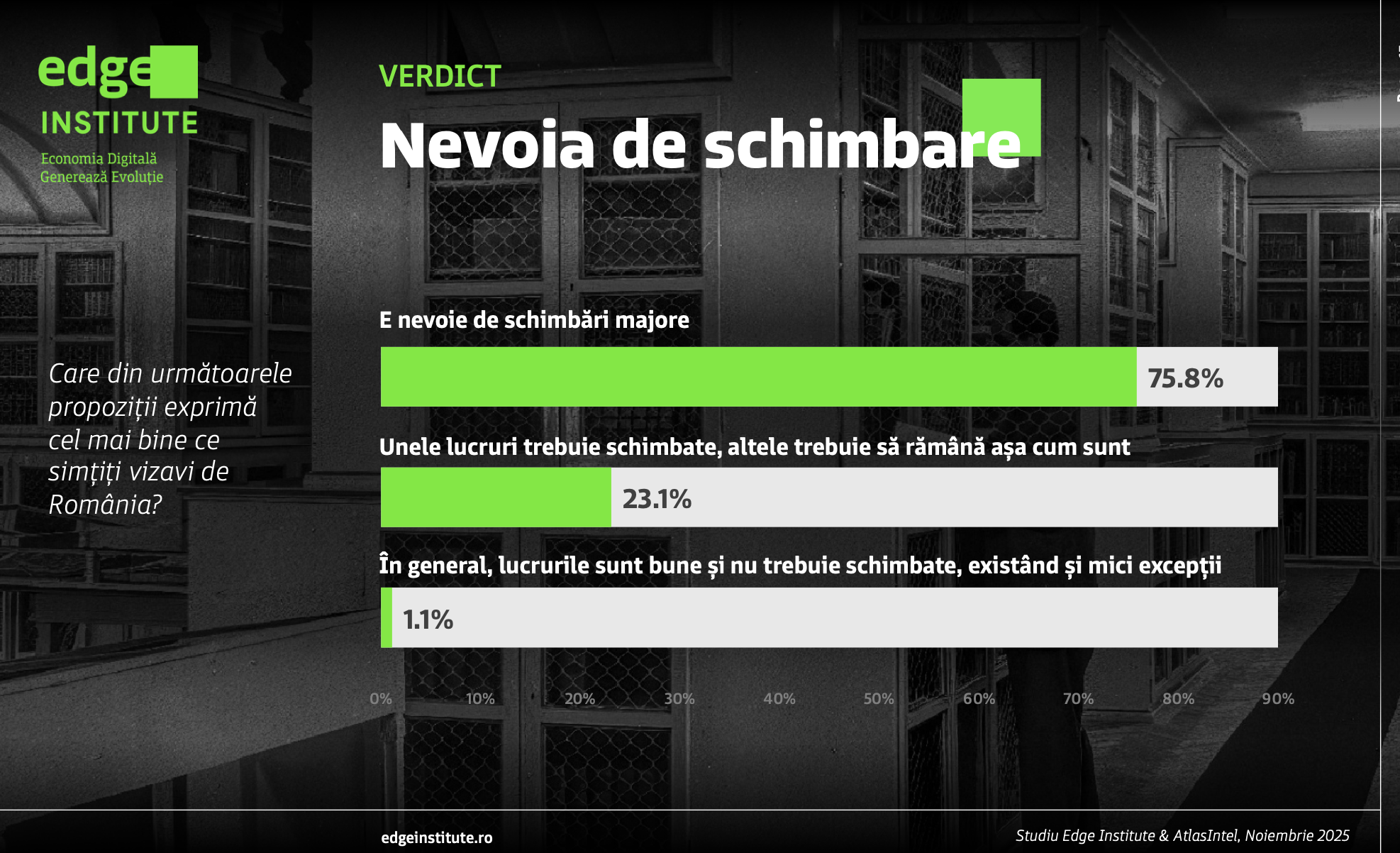 Studiul Edge Institute și AtlasIntel a fost realizat pe un eșantion de 2.240 de respondenți adulți din România, în perioada 12–19 noiembrie 2025, prin recrutare digitală aleatorie, și oferă una dintre cele mai clare imagini de până acum asupra modului în care românii privesc statul digital și reformarea administrației publice.