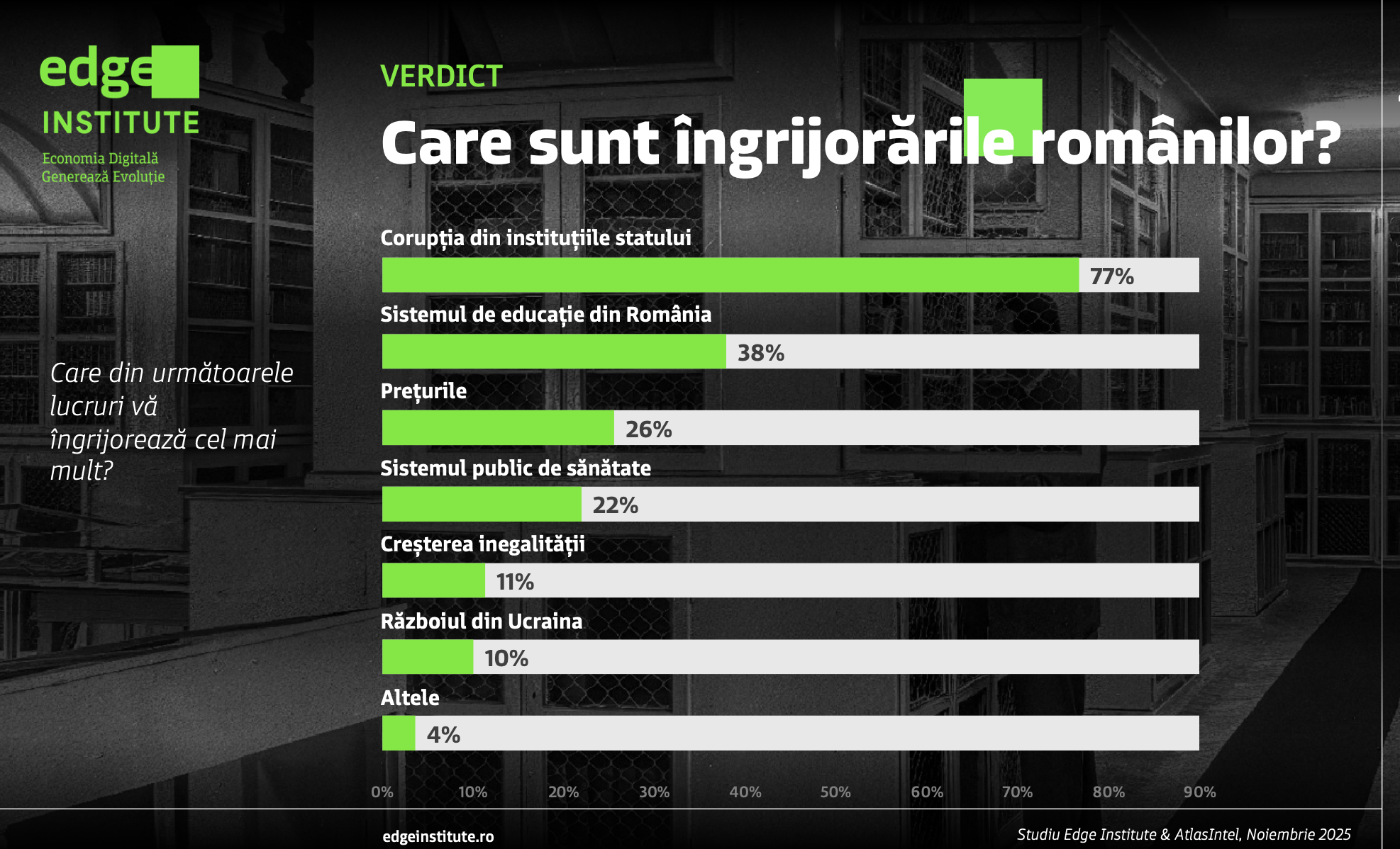 Un alt mesaj puternic al cercetării este nevoia de schimbare profundă în modul în care funcționează statul. Peste 75% dintre români cred că România are nevoie de reforme majore, iar corupția rămâne principala îngrijorare, înaintea problemelor din educație și sănătate sau a contextului internațional. În acest cadru, digitalizarea este văzută drept o posibilă soluție pentru creșterea transparenței și eficienței administrației.