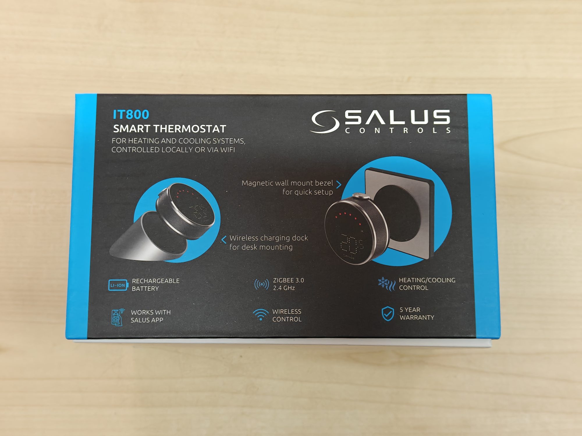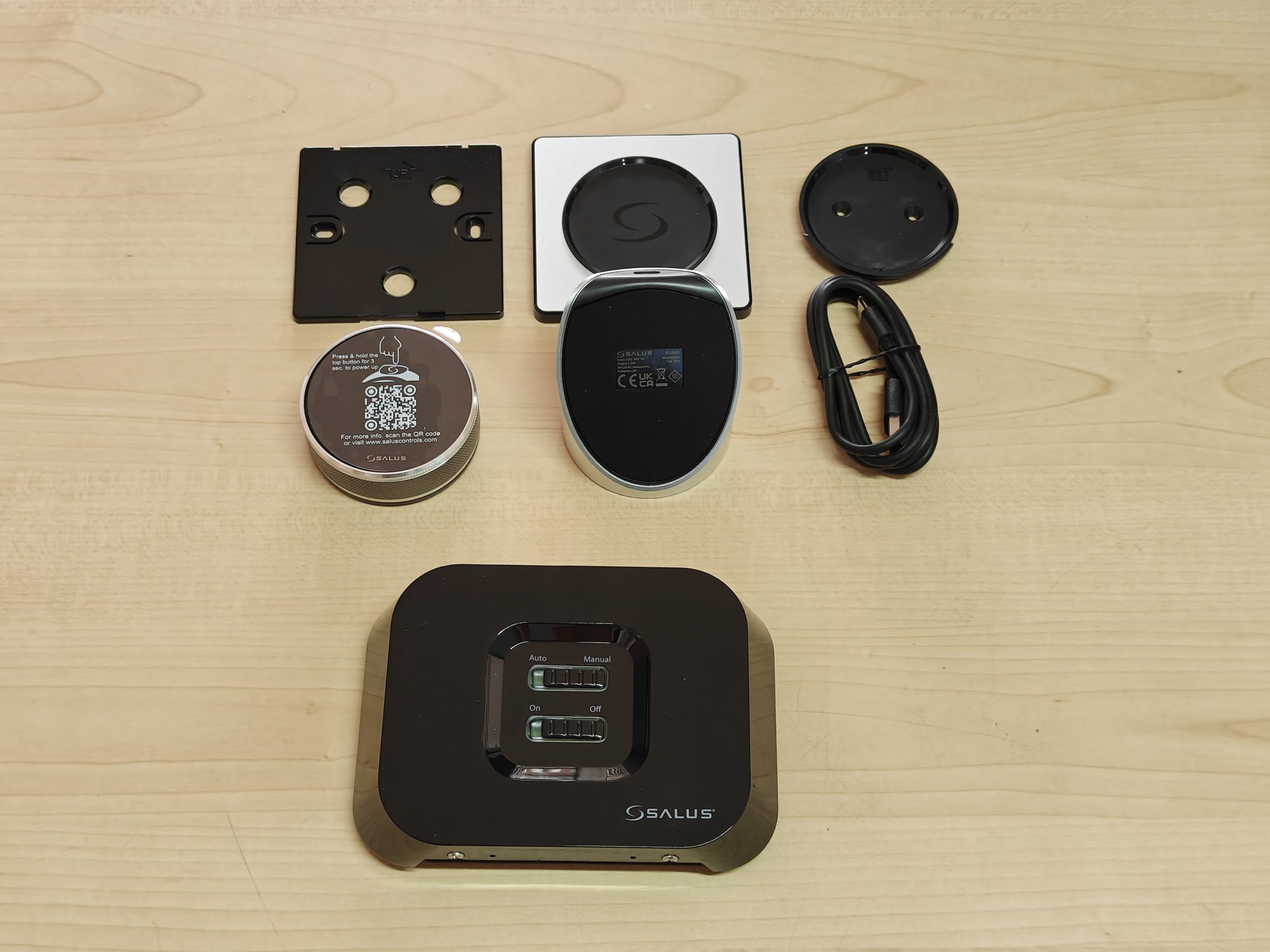 - Termostatul Salus iT800 WiFi – principalul dispozitiv de control, cu un design modern și un display LCD clar, iluminat, care afișează temperatura și modurile active.