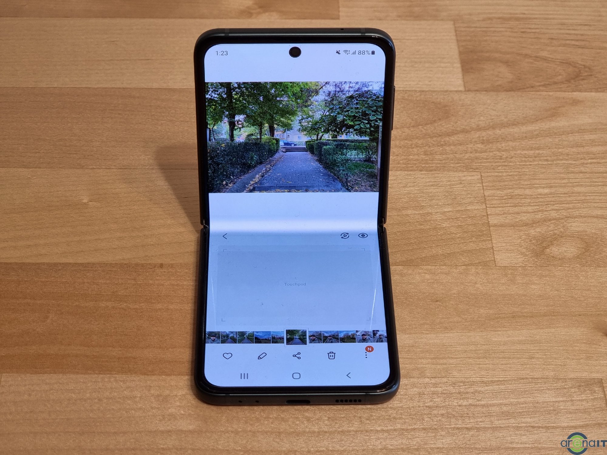 Construcția pliabilă ajută Z Flip 3 să fie remarcat și prin caracteristici pe partea de software. Camera foto principală precum și cea ultra-wide pot fi folosite pentru a realiza poze de tip selfie, iar calitatea acestora este mult superioară celei de la camera frontală de selfie. Ecranul secundar va fi folosit pe post de oglindă. Tot pe ecranul secundar veți putea citi notificările pentru adresele de mail, WhatsApp, Facebook sau alte aplicații alături de starea vremii sau ora. Telefonul se poate plia la 90 de grade, iar unele aplicații sunt optimizate pentru a fi utilizate în acest mod. În cazul galeriei foto, jumătate din ecran va prezenta poza, iar cealaltă jumătate va putea fi folosită ca un trackpad pentru a naviga prin galerie. De asemenea, va fi mult mai ușor de a face o poza singuri cu oricare dintre camerele foto de pe telefon dacă îl îndoiți și așezați pe o suprafață orizontală. Eu mi-am făcut un scurt timelapse să mă văd cât sunt de eficient în a tăia lemne.