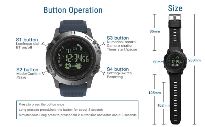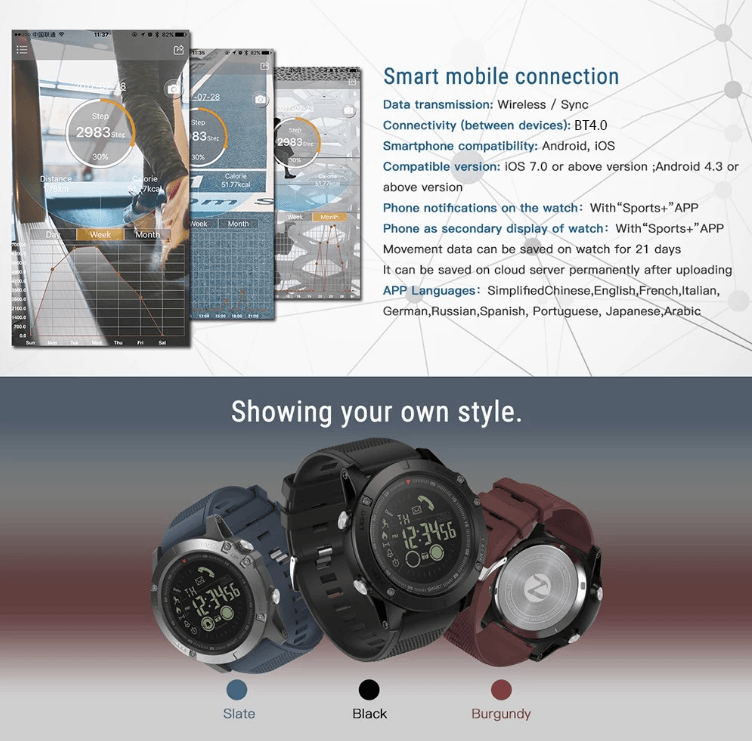 Ceasul are un ecran LCD de 1.24 inch, Bluetooth 4.0 si este rezistent la apa avand protectie IP67. Fiind un ceas dedicat sportivilor are functii utile: indica pasii parcusi, caloriile arse, poate accesa camera, mesajele si apelurile si inclusiv retelele de socializare.