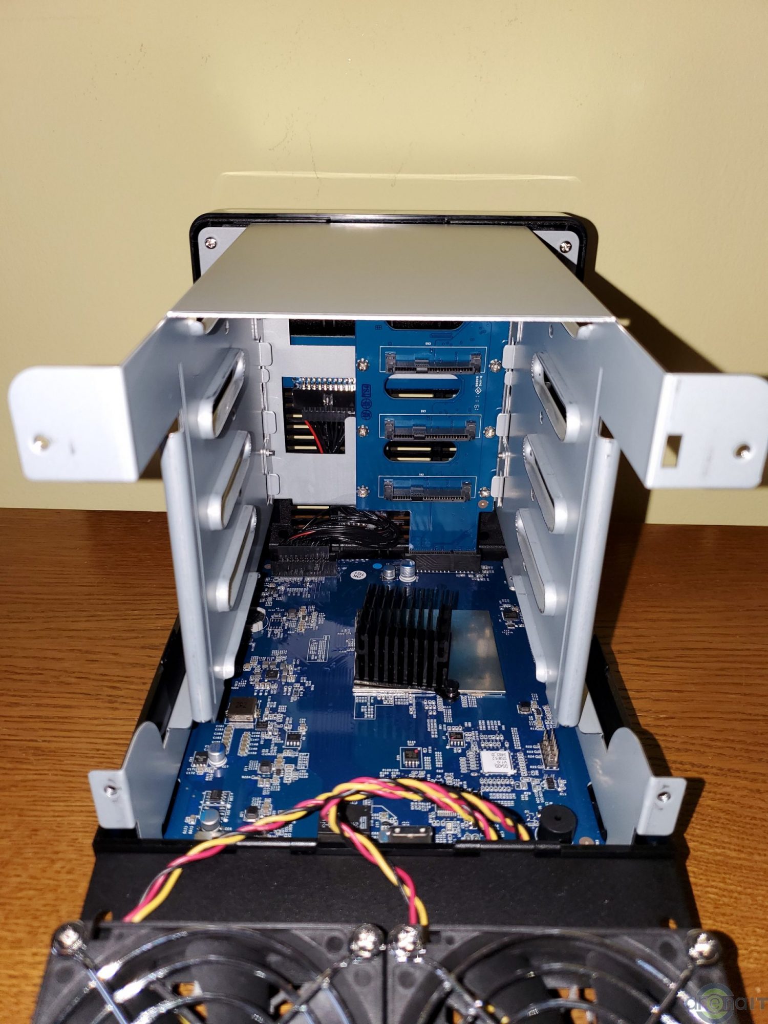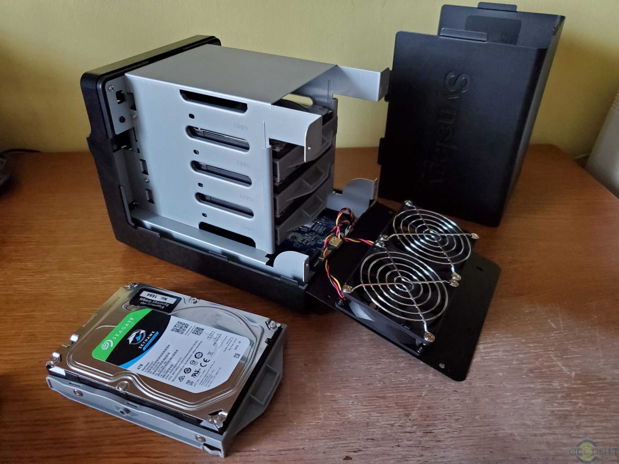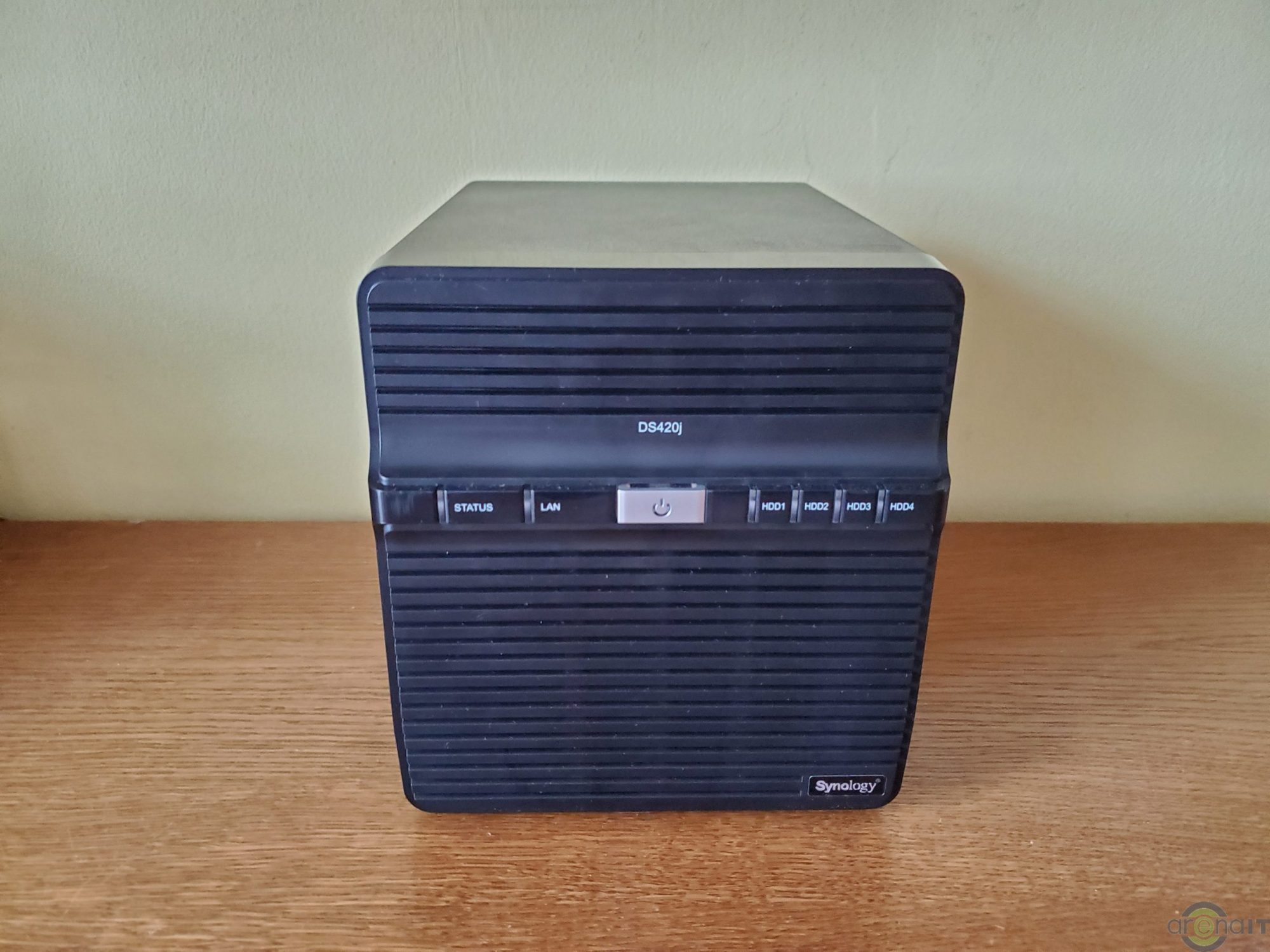 Cu un numar de 4 bay-uri pentru HDD-uri/SSD-uri, DS420J este „grasut”. Accesul la cele 4 bay-uri se face foarte usor si ai nevoie doar de o surubelnita pentru a prinde HDD-urile/SSD-urile pe sinele prezente in interior. Racirea este asigurata in partea din spate de 2 ventilatoare de 80mm fiecare. Frontal avem doar butonul de power si LED-uri pentru fiecare din cele 4 bay-uri pentru mediul de stocare, pentru conexiunea LAN, status si putere. Cu 4 HDD-uri in el, are undeva la 5-6kg, iar daca esti sensibil la somn il vei auzi noaptea daca dormi in aceiasi camera si este folosit. Memoria RAM nu poate fi crescuta.