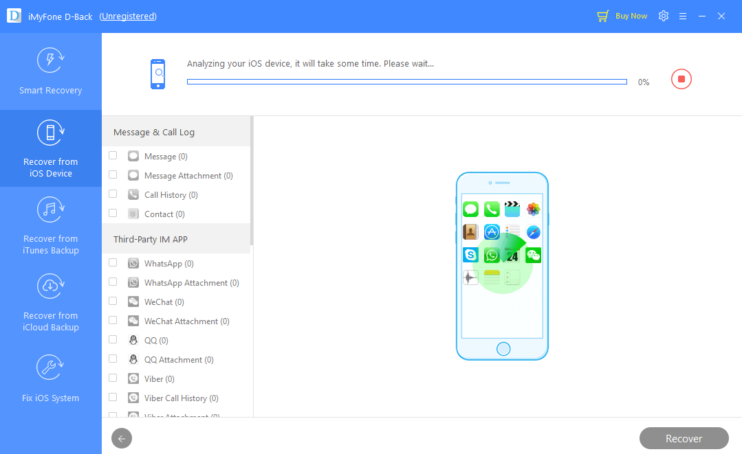 Asa cum spune si numele celor 3 moduri de recuperare, aplicatia este capabila sa gaseasca datele pierdute din 3 locuri: din telefon, din iTunes sau din iCloud. Smart Recovery imbina cumva aceste 3 moduri si dureaza destul de mult sa scaneze tot telefonul. De fapt conteaza si ce capacitate de stocare ai si cat de plina este memoria. Pentru 64GB si doar cu 3GB ramasi liberi, am stat aproximativ 20-25 de minunte pana mi-a scanat tot telefonul.