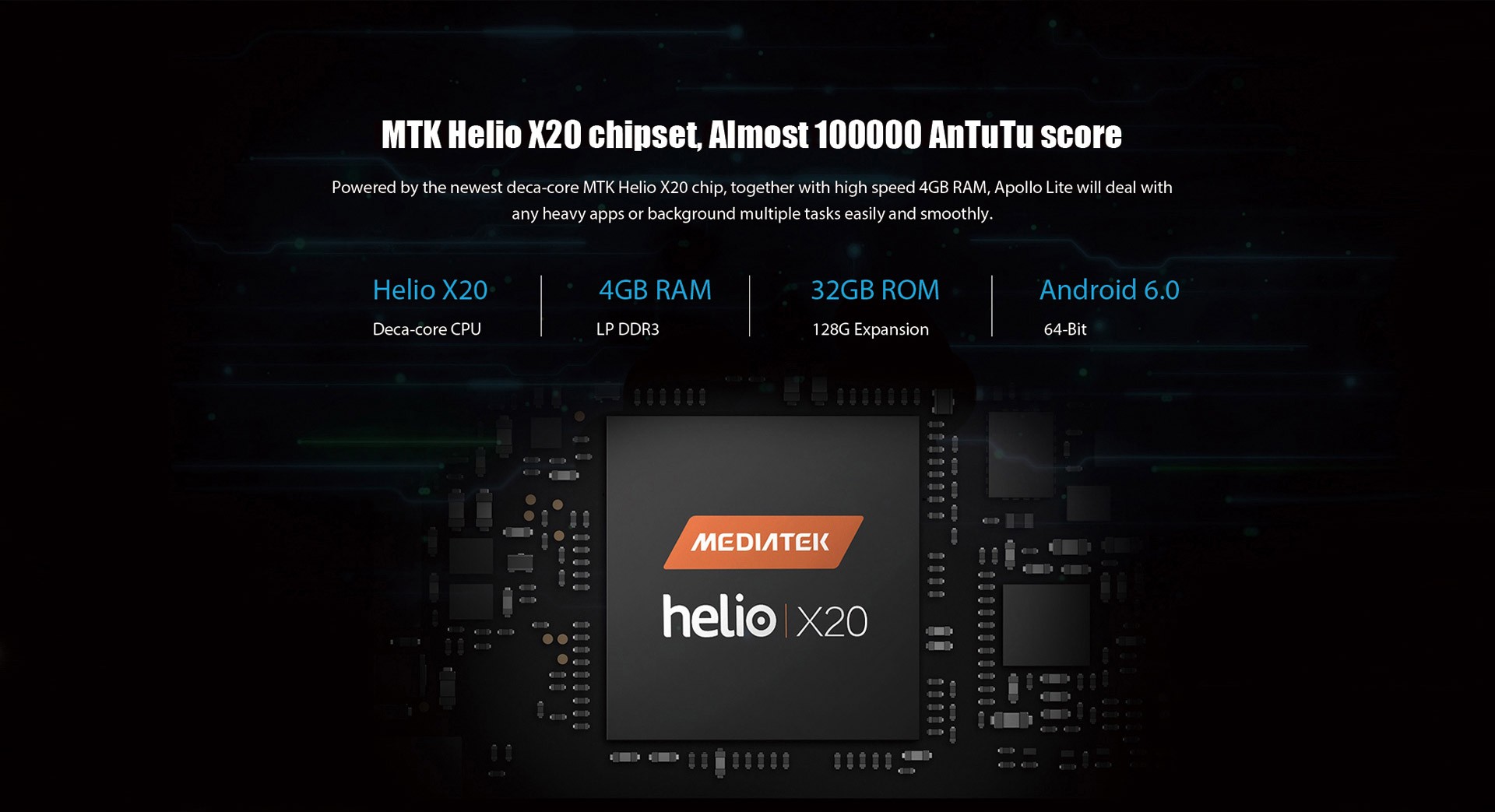 Apollo Lite este echipat cu un procesor deca core Helio X20, 4GB de RAM DDR3, 32GB de stocare, ecran Full HD de 5.5 inch, senzor de amprenta, carcasa metalica, camere de 16/5MP cu filmare 4K, port USB C si Android 6.0.