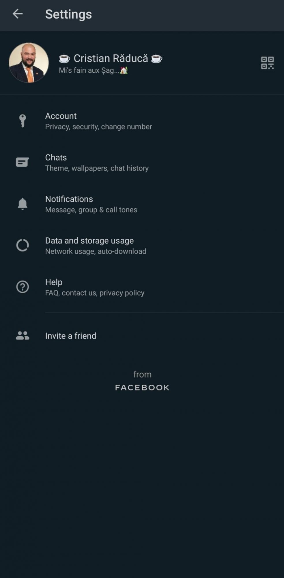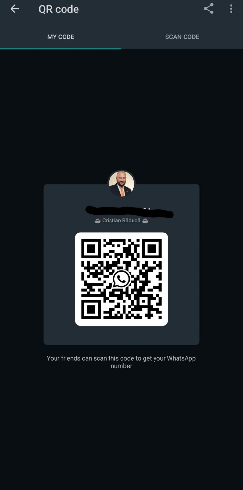 Deși nu mi-a fost brevetată ideea, se pare că Mark Zuckerberg a aflat de ea. 🙂 Astfel, dacă sunteți înrolați în programul Beta al WhatsApp și aveți instalată versiunea 2.20.171, puteți transmite sau salva datele personale de contact extrem de simplu. Tot ce aveți de făcut este să mergeți la setări, și să apăsați pe codul din dreptul numelui. Veți avea parte de două opțiuni – fie să vizualizați (și să trimiteți altor utilizatori) codul propriu, fie să scanați unul de la un alt utilizator:
